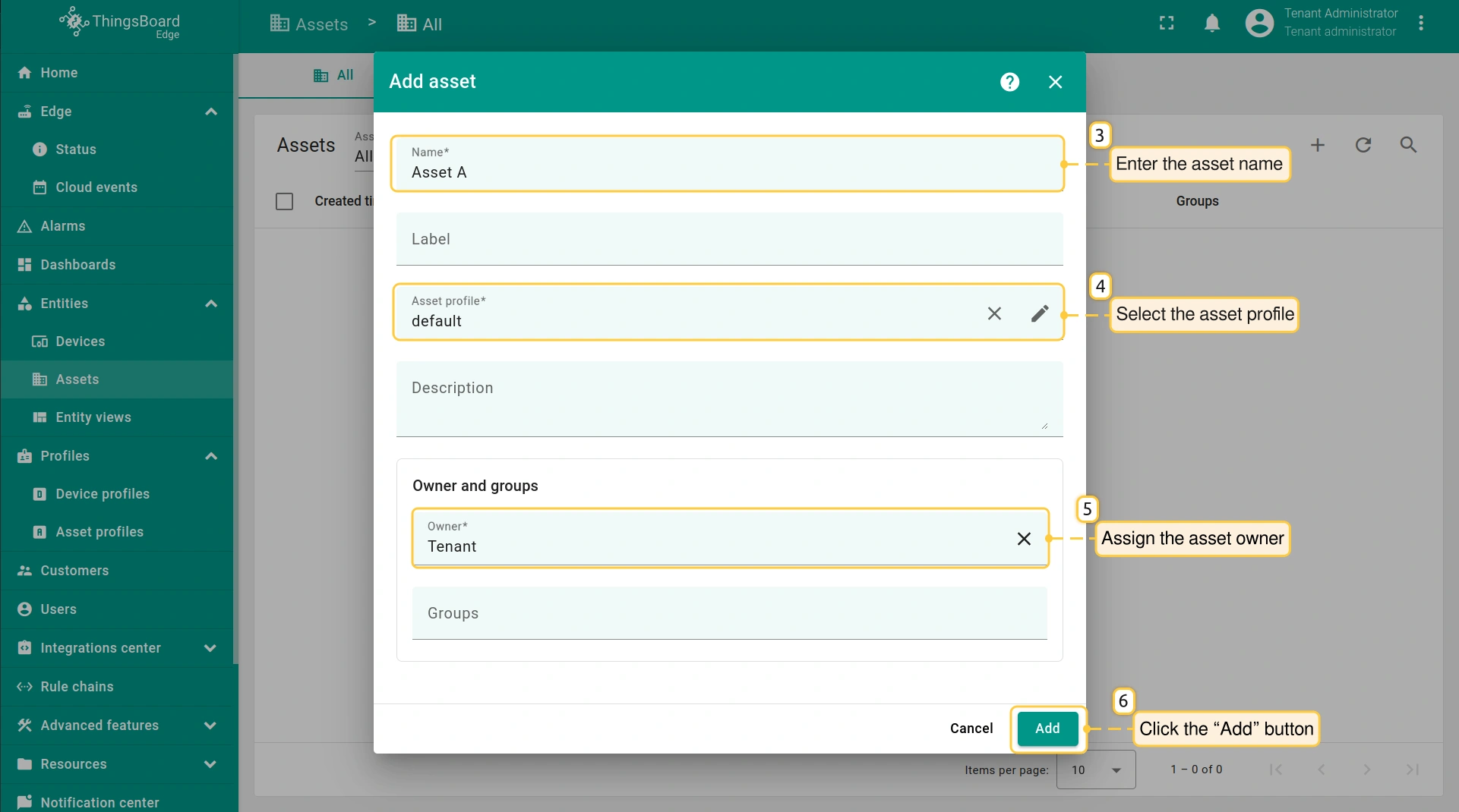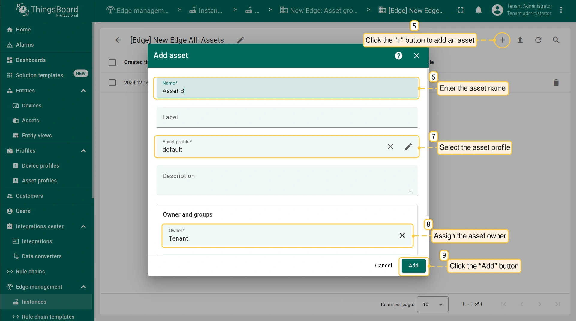 - Assign the asset owner in the "Owner" field (default: "Tenant").