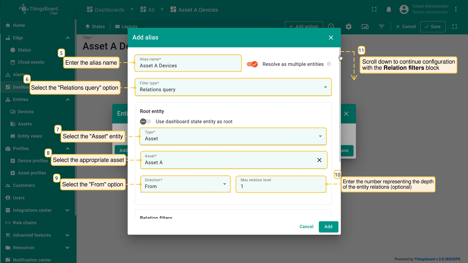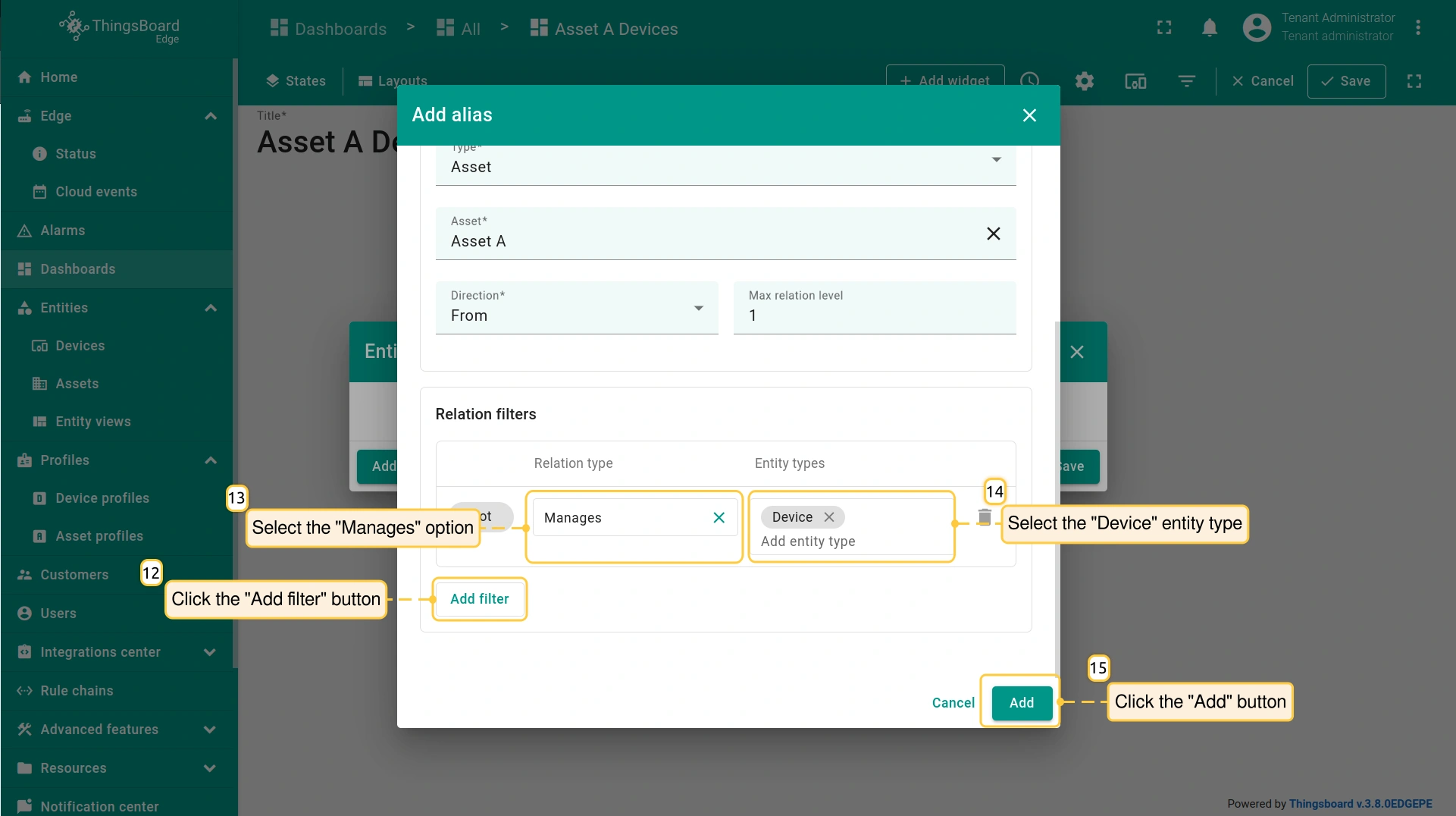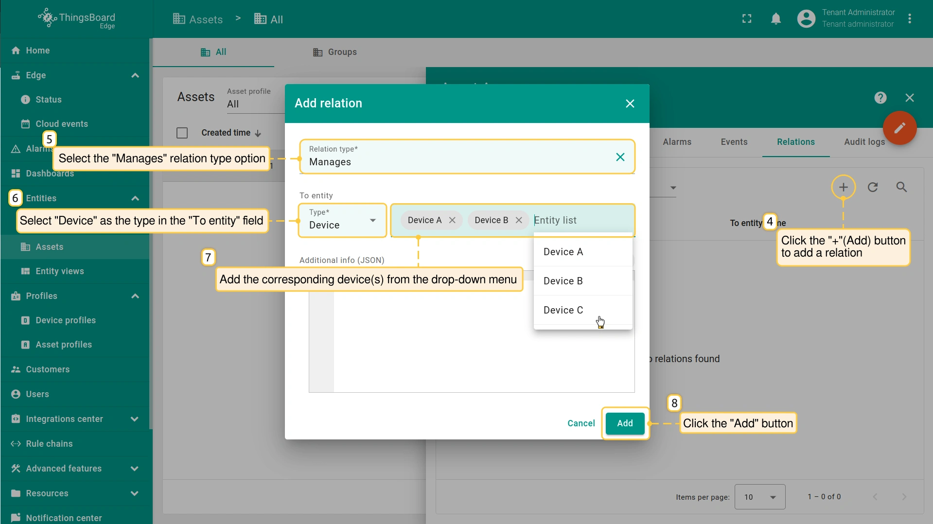 要在Asset与另一实体(如 device)之间 构建关系,请进入 Entities > Assets 区域并按以下操作: