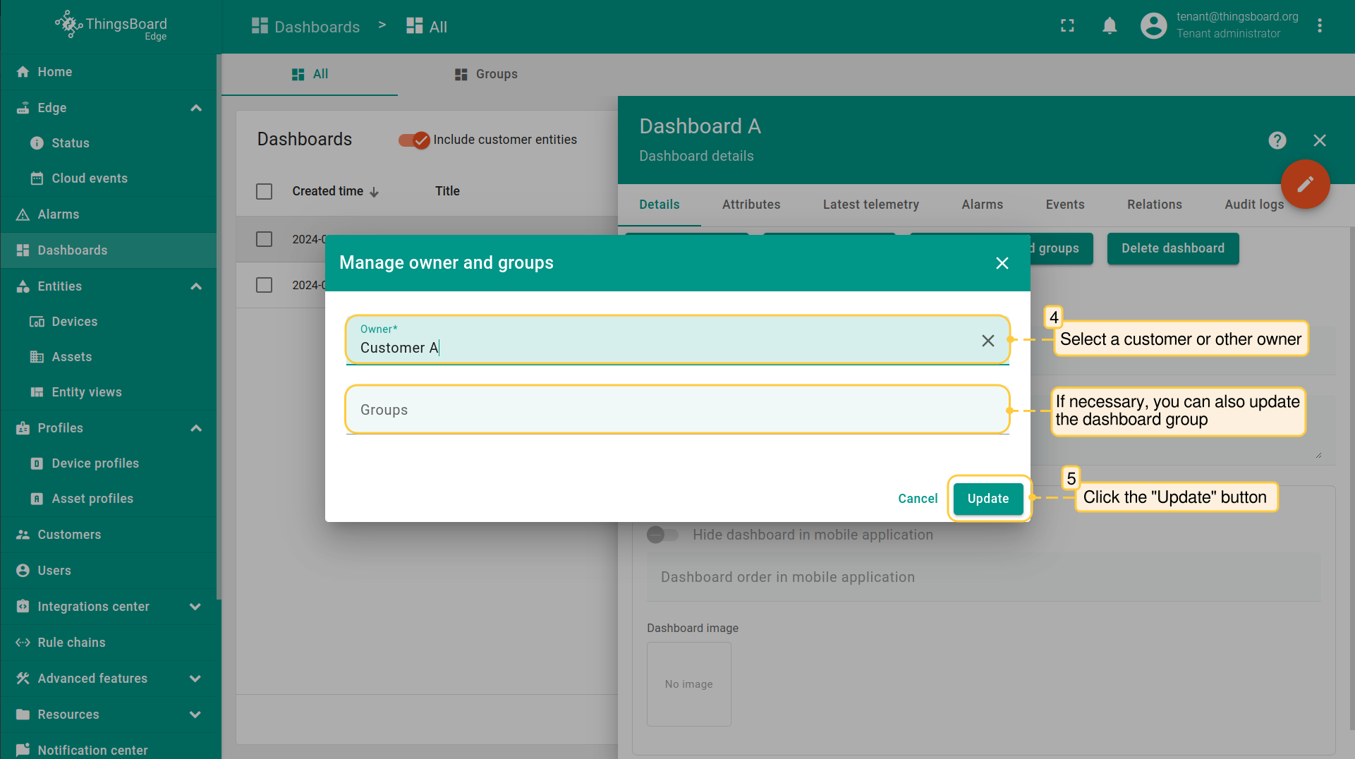 - In the "Manage owner and groups" pop-up window, select owner and click the "Update" button. You also may update the dashboard group if needed.