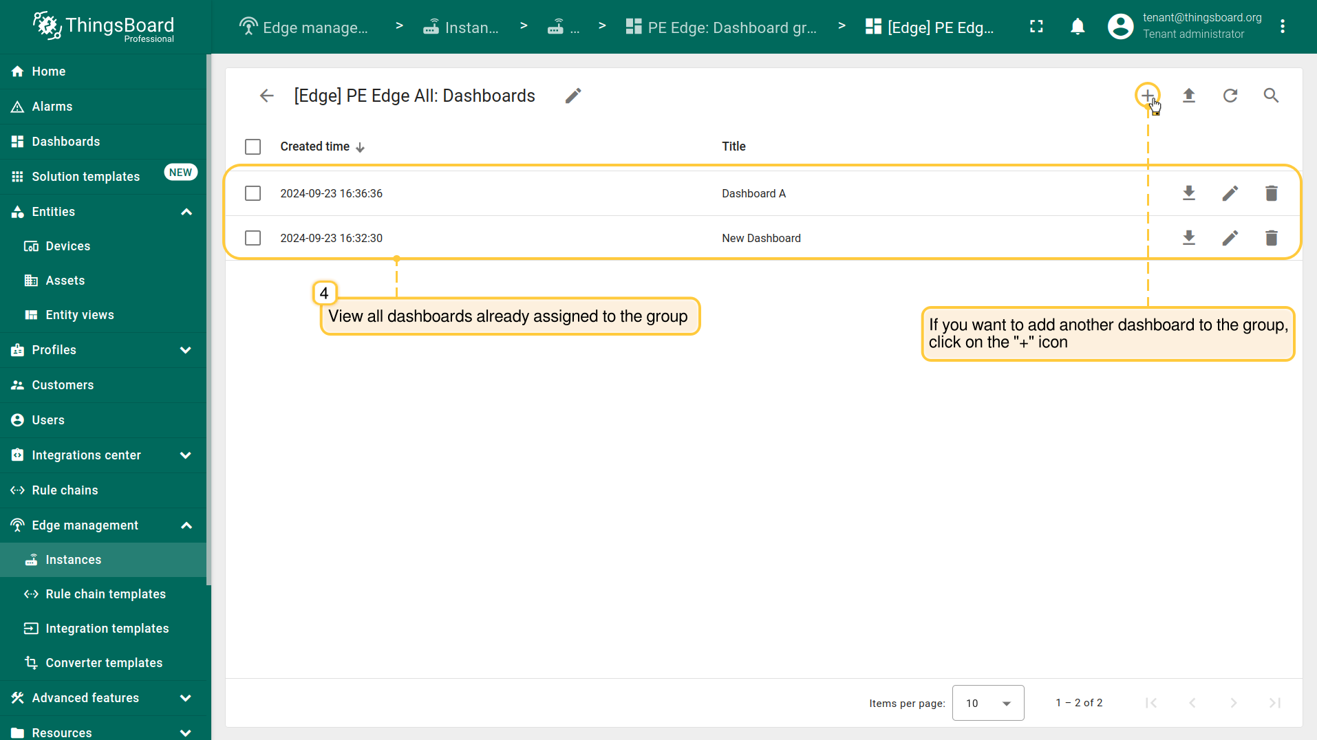 - Ensure that you have previously created, configured and assigned the Dashboard to the appropriate entity group. Then, go to the Edge management > Instances section and open the "Manage edge dashboard groups" page. You can see here all dashboards groups already assigned to the Edge instance. To assign another group to the Edge instance, click the "+" icon. To view the Dashboards in the group, click on the group itself.
