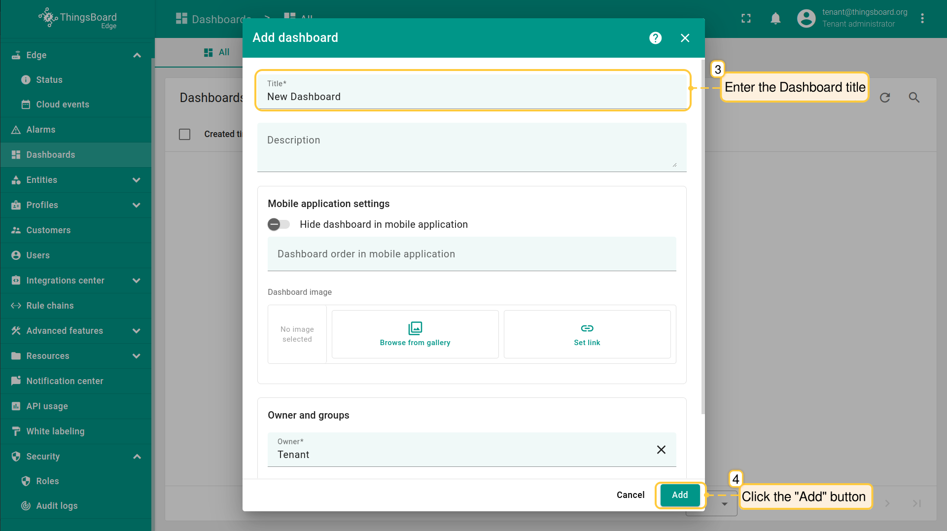 - In the pop-up window, enter a dashboard title. Other fields are optional. Click the "Add" button to proceed