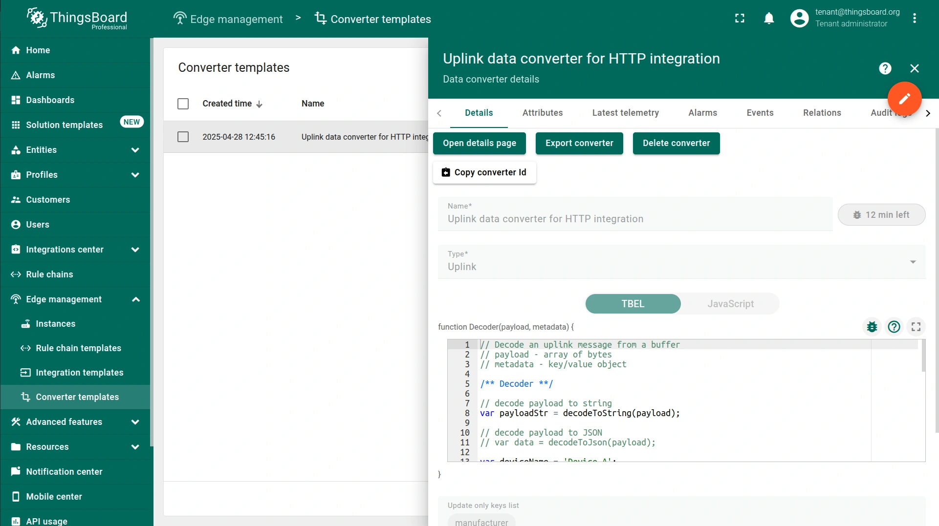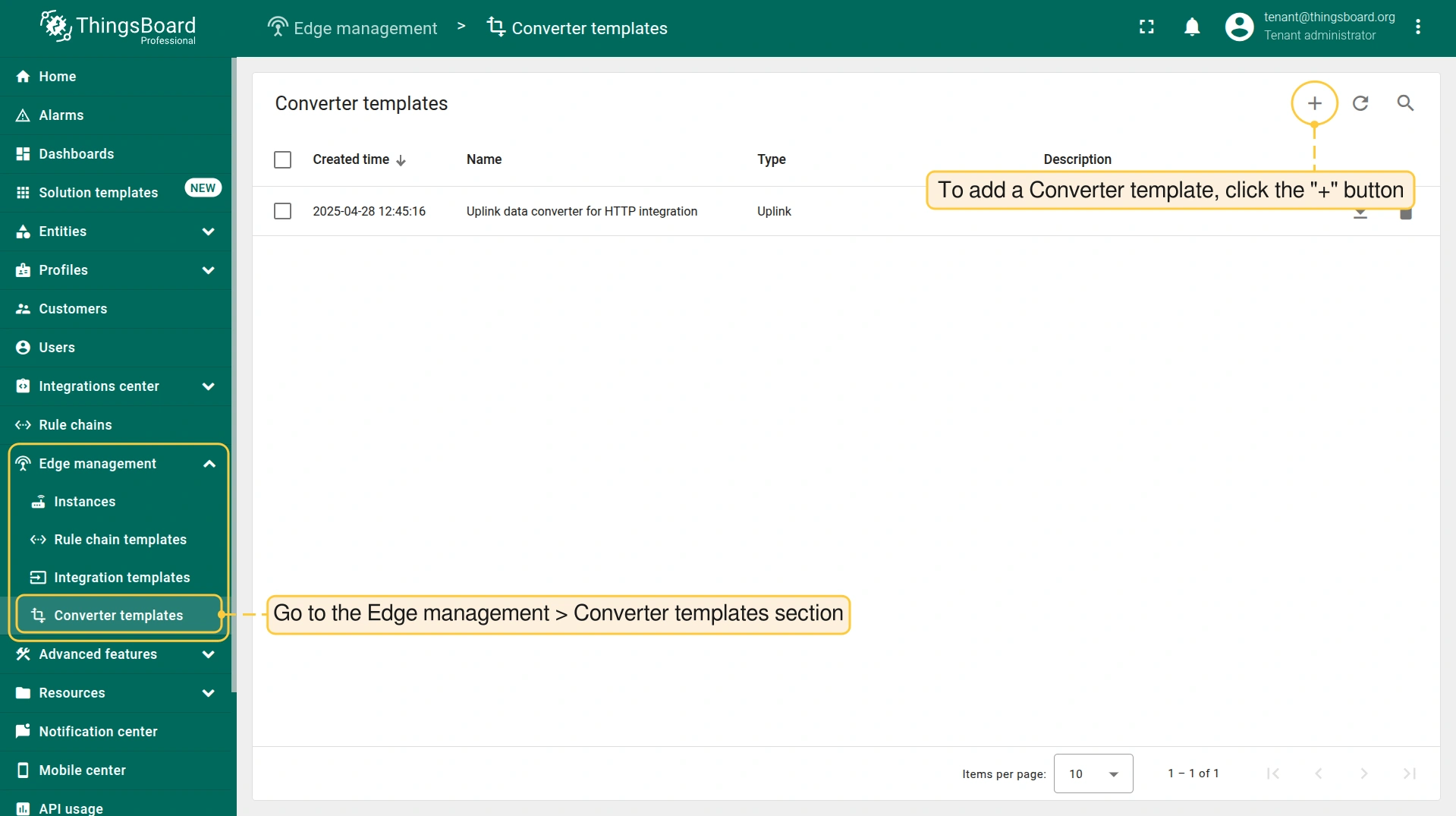 Converter templates can only be created by a tenant administrator. To create a Converter template, log in to the Cloud and go to the Edge management > Converter templates section. These Converter templates are going to be used later in the Integration templates configuration.