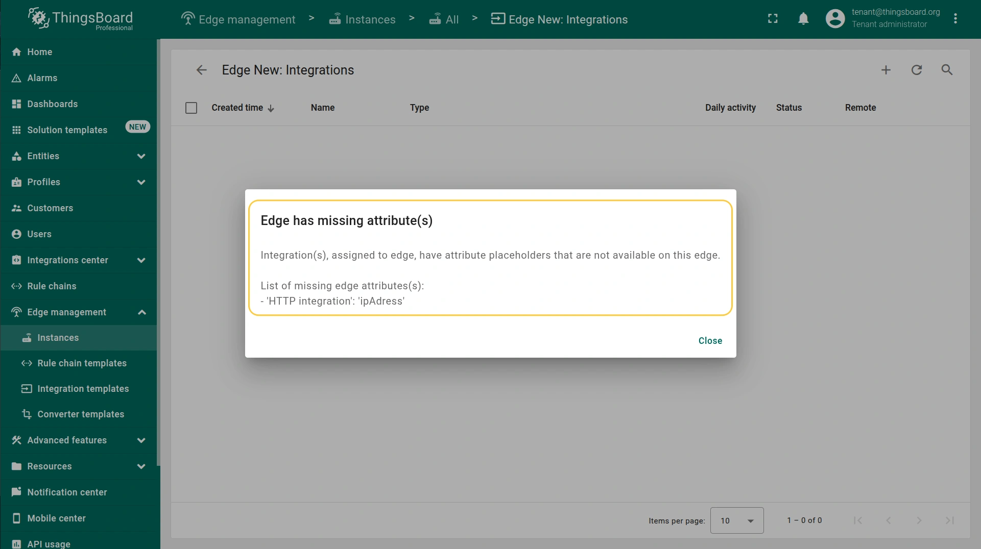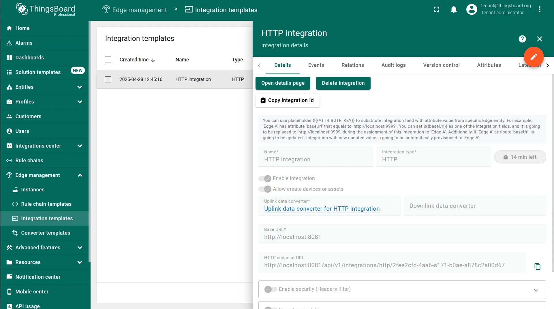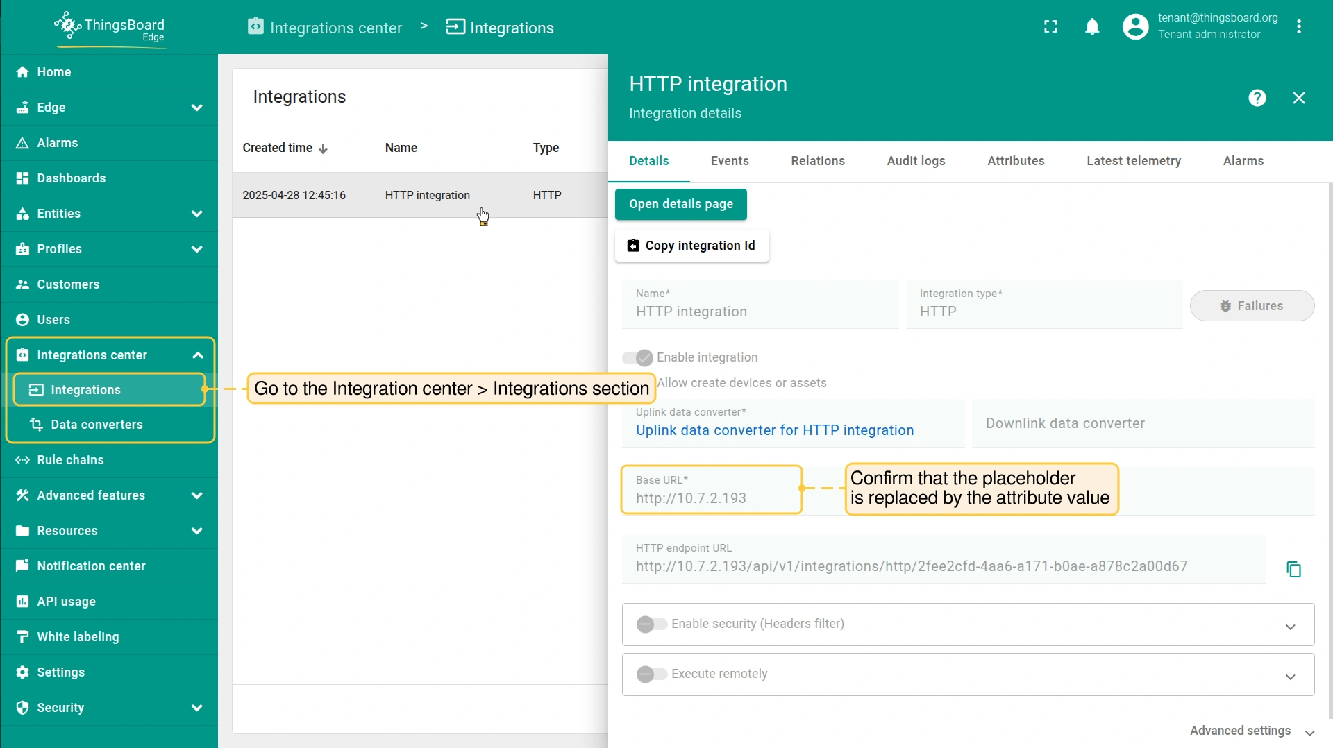 - To confirm that the placeholder is replaced by the attribute value, log in to your ThingsBoard Edge instance, go to the Integration center > Integrations section and click the integration.