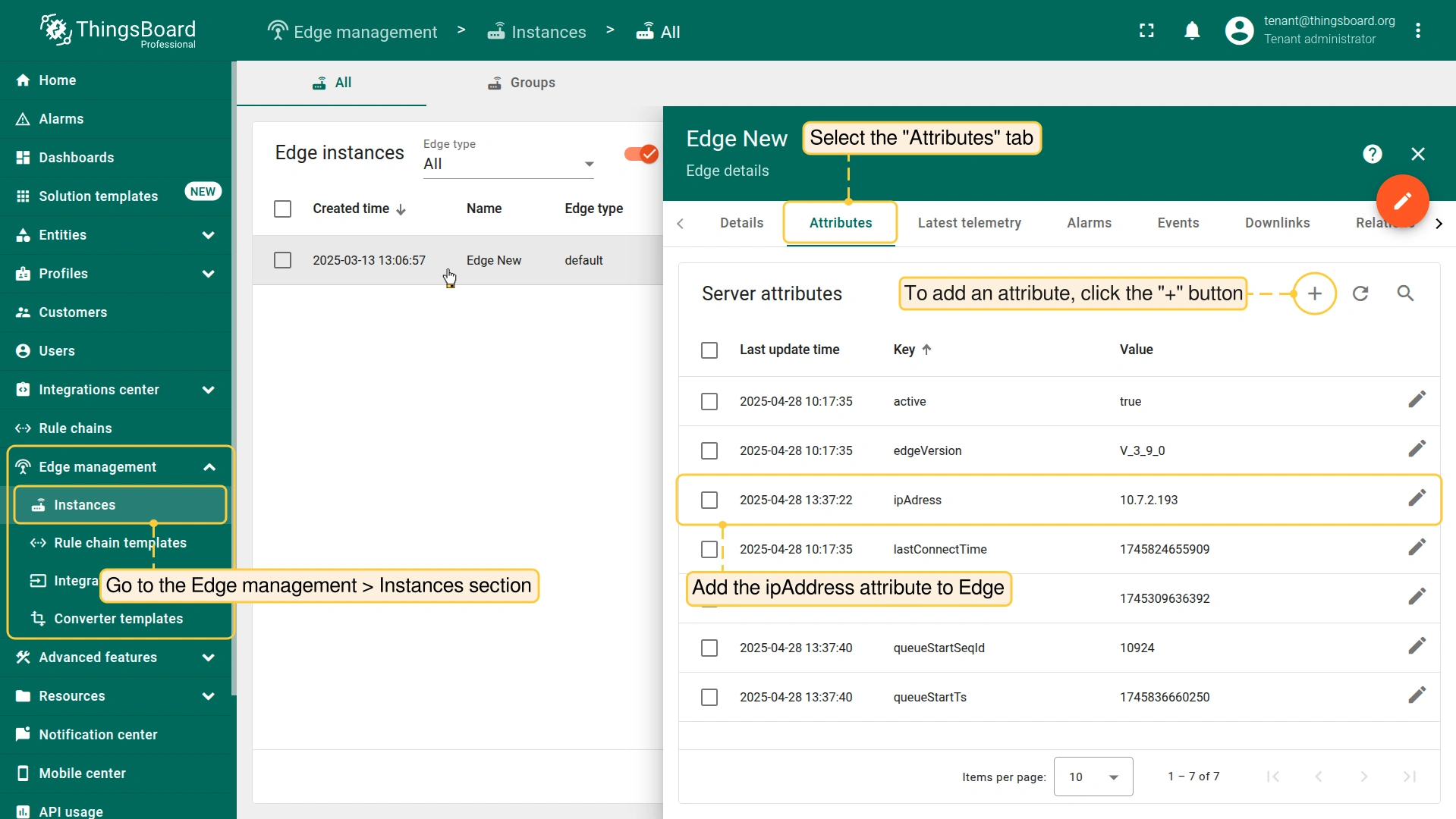 - Go to the Edge management > Instances section, click it and select the "Attributes" tab. Add the ipAddress attribute to Edge.