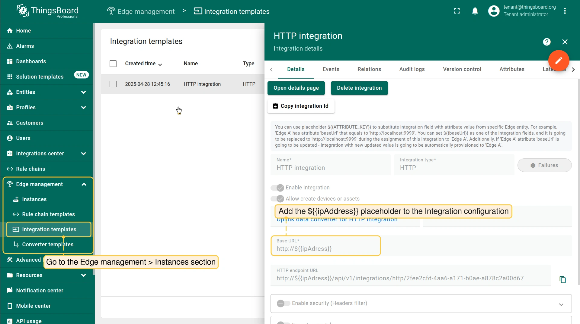 - Go to the Edge management > Instances section, click it and add the ${{ipAddress}} placeholder to the Integration configuration.