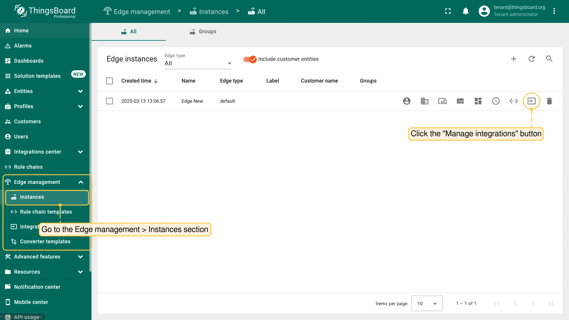 - Go back to the Edge management > Instances section and click the Manage Integrations button of the corresponding Edge entity.