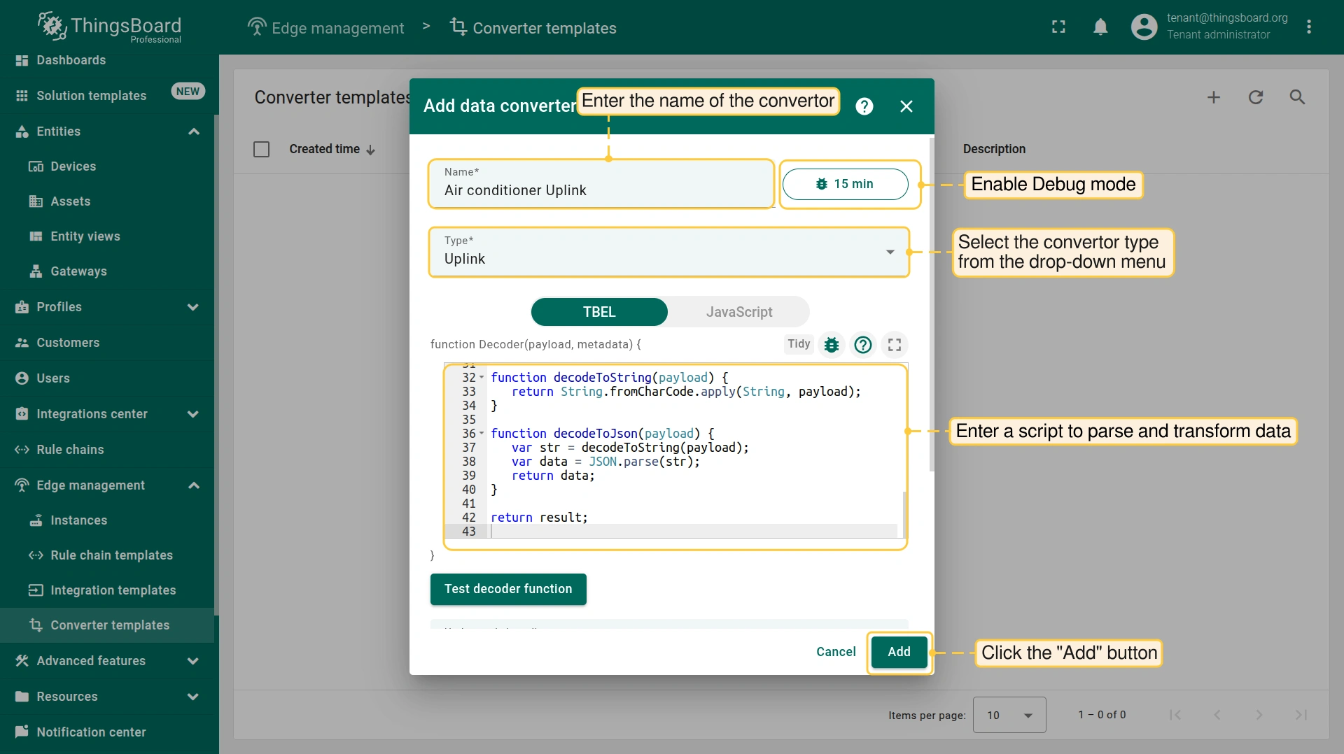 Click the “plus” button and select the “Create new converter” option. To view the events, enable “Debug” mode. In the “Function decoder” field, enter a script to parse and transform data.