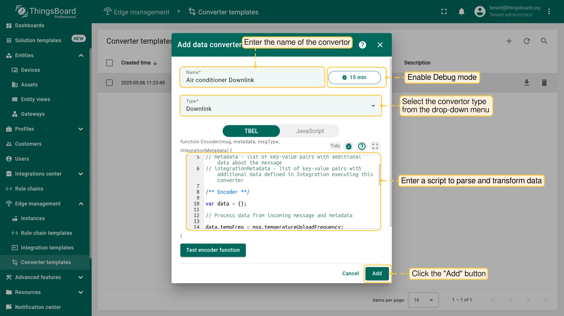 Now that the Uplink and Downlink converter templates have been created, it is possible to create an integration: