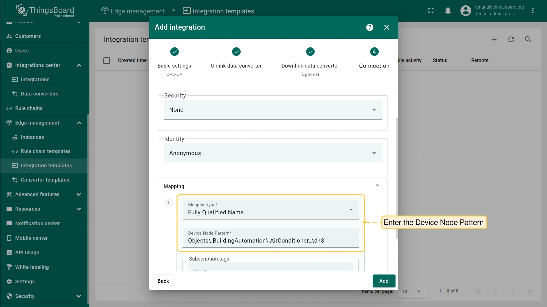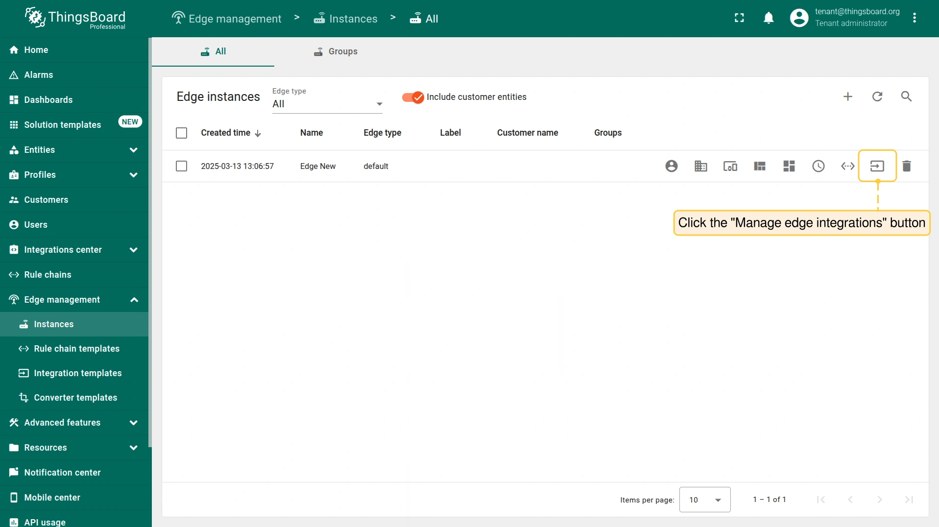 - Login to your ThingsBoard Edge instance and open the Integrations page. The placeholder is going to be replaced by the attribute value