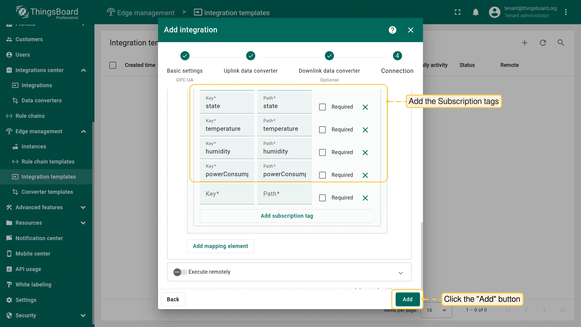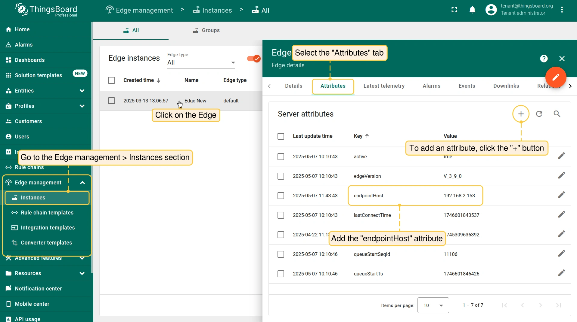 Once the converters and integration templates are created, we can assign the Integration template to the Edge. Since we are using placeholder ${{endpointHost}} in the integration configuration, we need to add the endpointHost attribute to the Edge first. You need to provide the Endpoint Host of the OPC-UA Server (see Prerequisites). Once the attribute is added, we are ready to assign the integration and verify that it has been added.