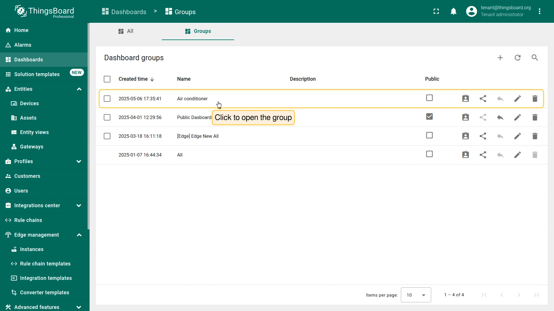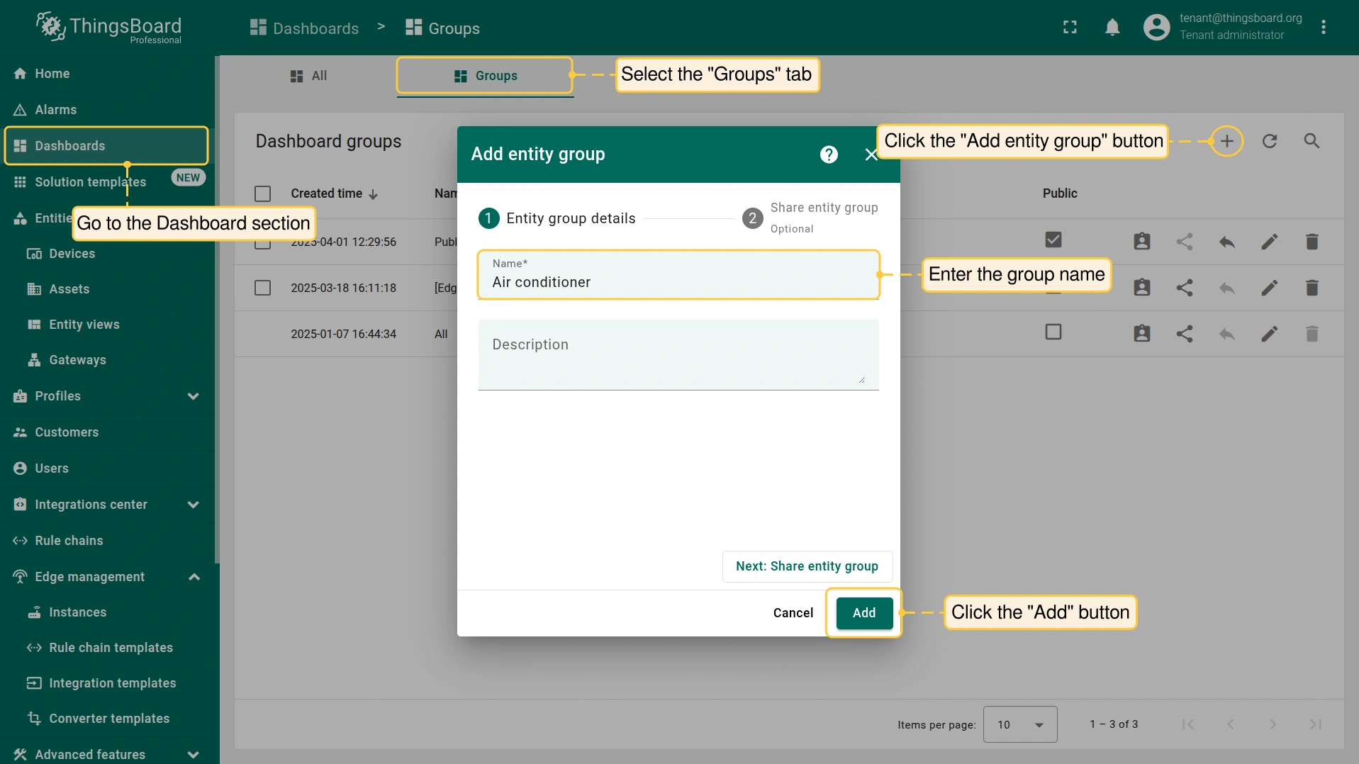 - Go to the Dashboard section and select the "Groups" tab. Click the "Add entity group" button to create a new Air conditioner group.