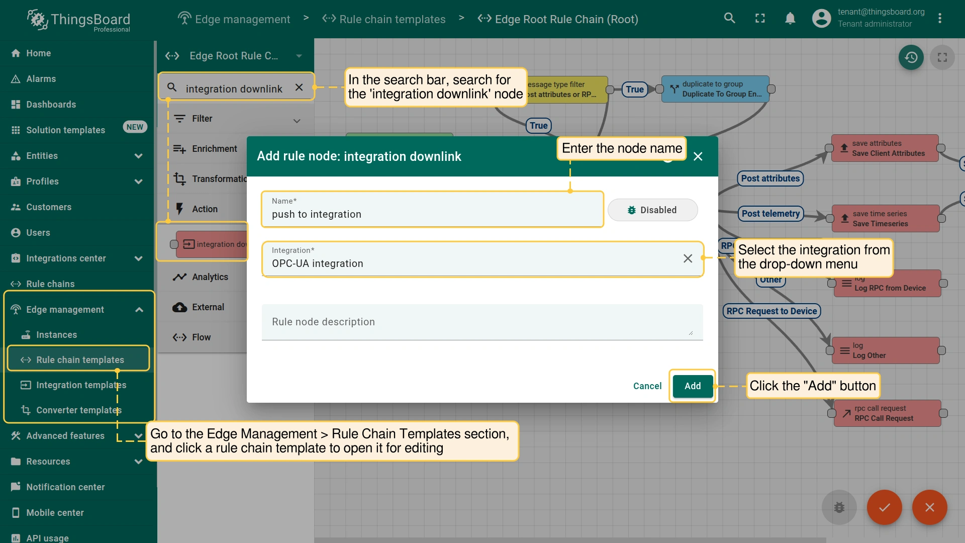 - To send a downlink over integration, we need to modify the Edge Root Rule chain.