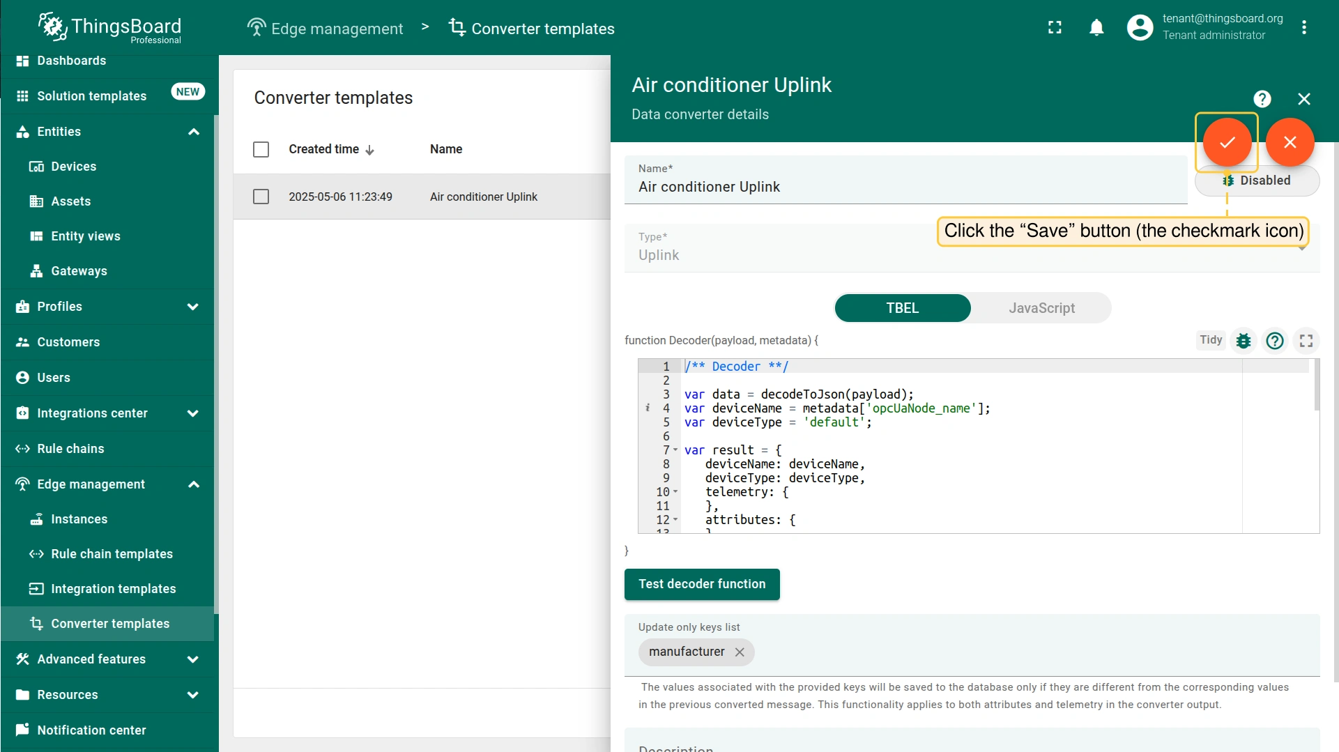 The purpose of the decoder function is to parse the incoming data and metadata into a format that ThingsBoard Edge can consume.