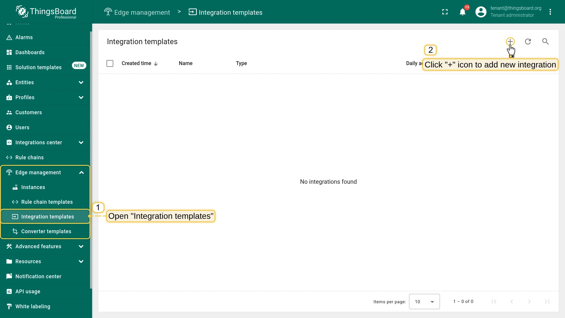 Let’s log in to the ThingsBoard Edge and go to the Integrations section.