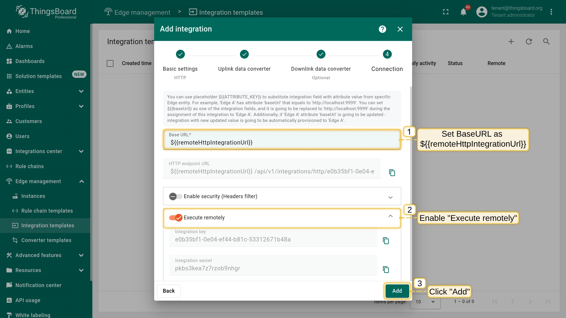 To view and copy the credentials, go to the Edge management > Integration templates section and click the integration.