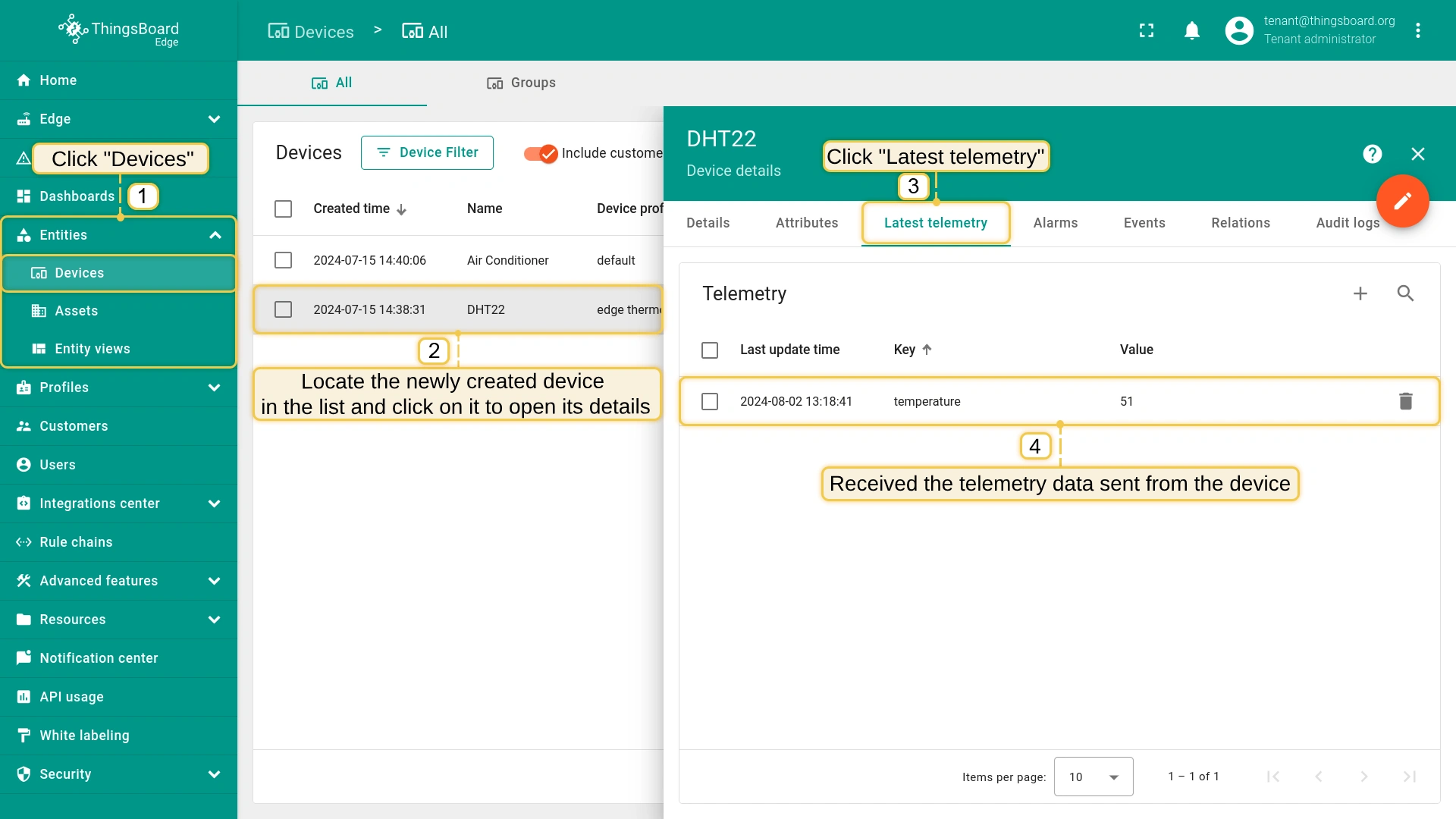 Go to the "Entities" section -> "Devices" page on the Edge to see the created device with data.