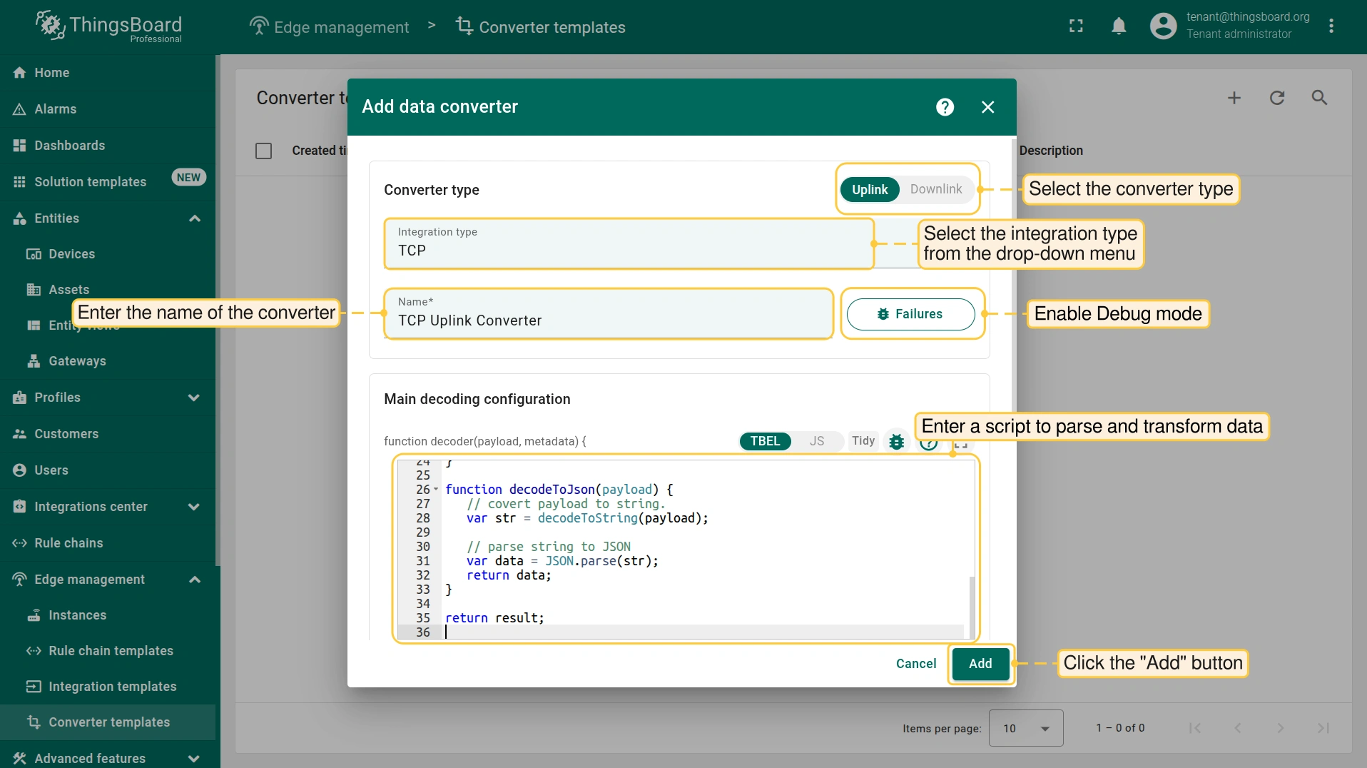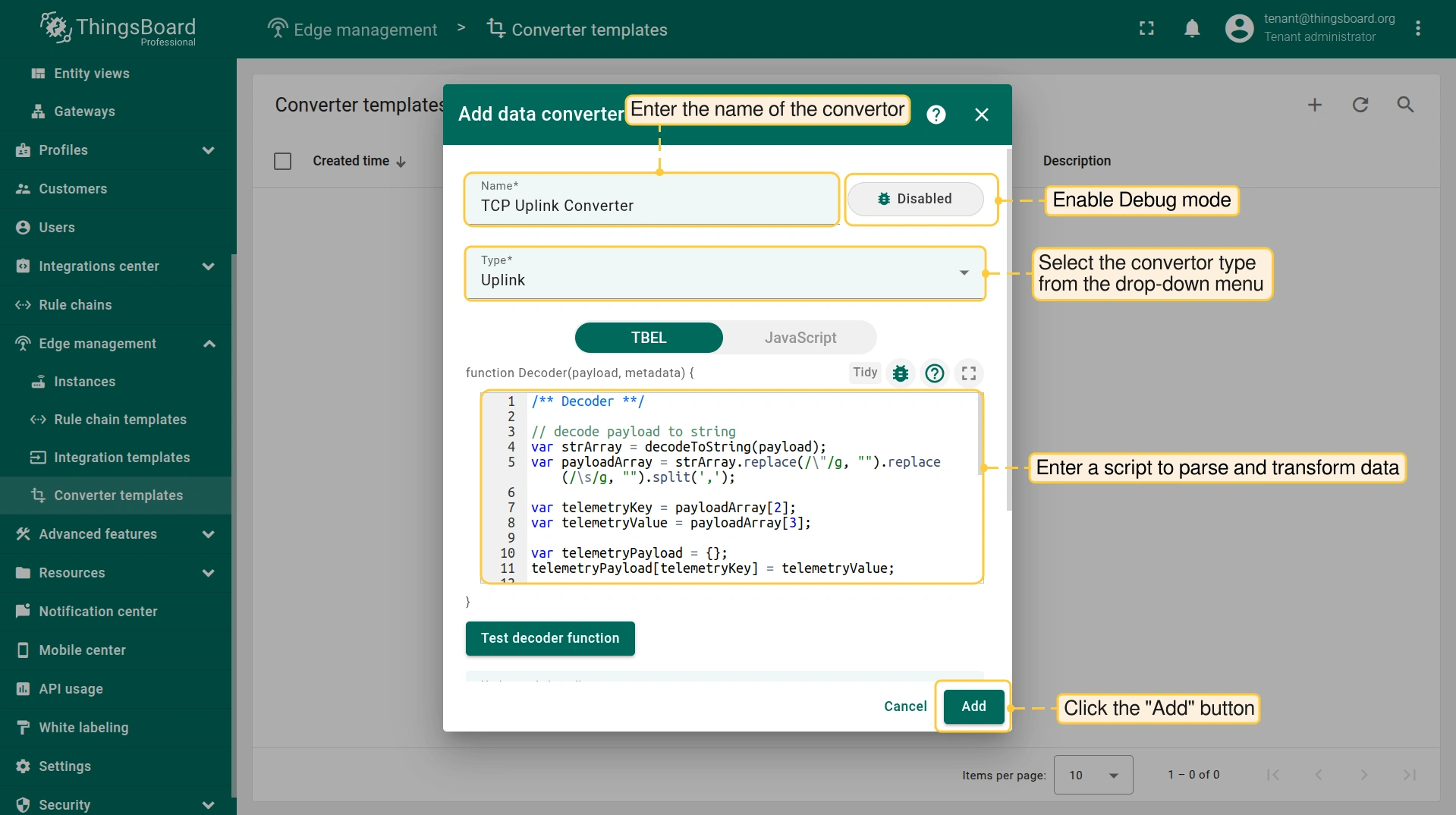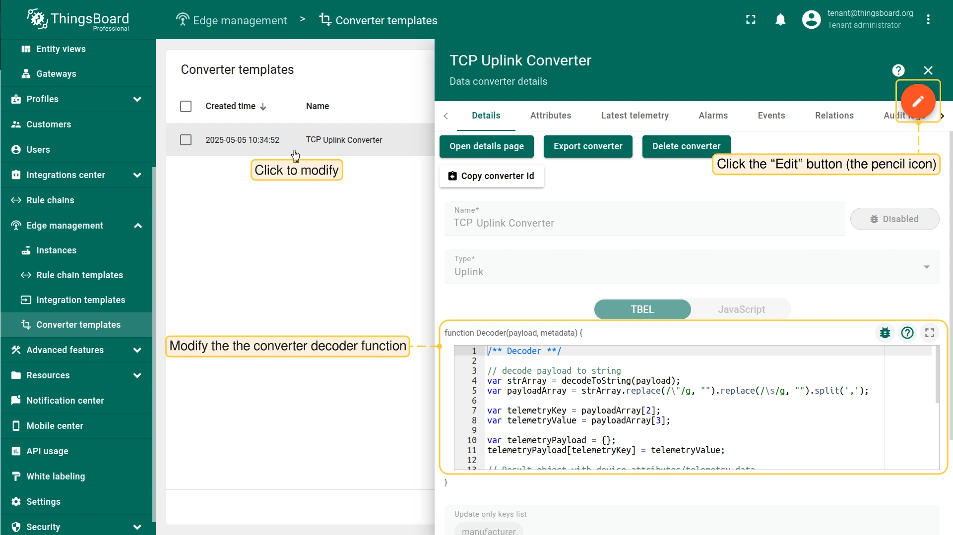 The uplink data converter is needed to convert the incoming data from the device into the format required for display on ThingsBoard Edge.