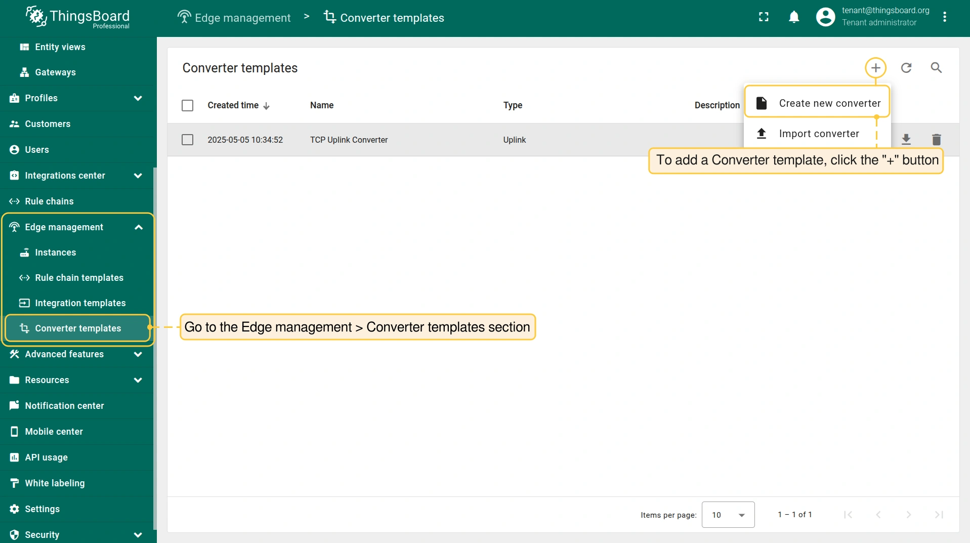 - Log in to the Cloud and go to the Edge management > Converter templates section. To create a Converter template, click the “Add data converter” button (the + icon) and select the “Create new converter” option.