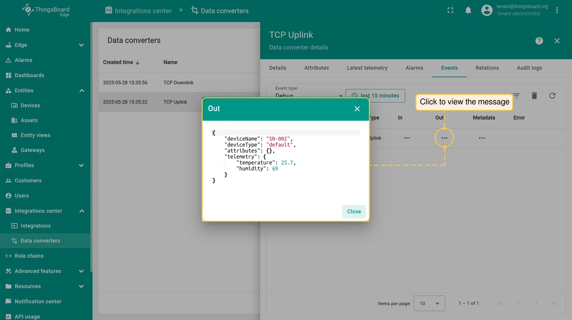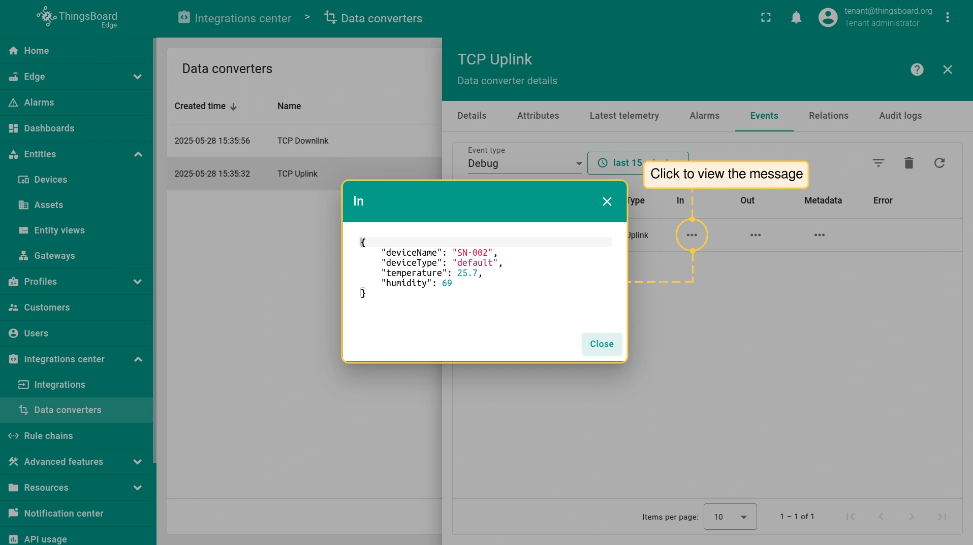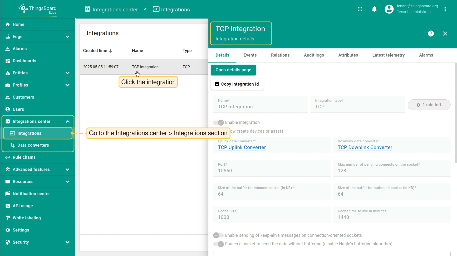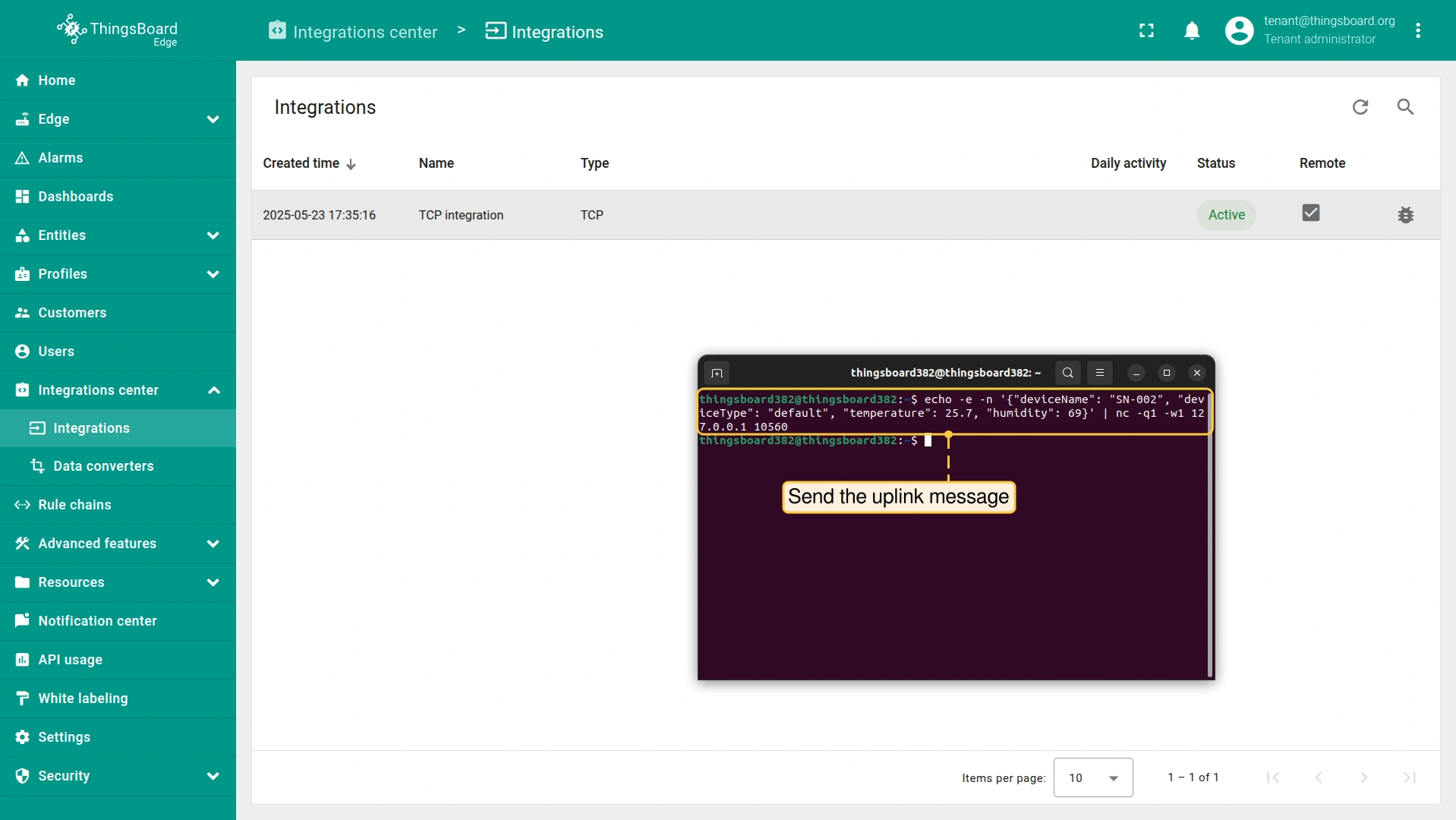 - Login to your ThingsBoard Edge instance and go to the Integrations center > Integrations section. Confirm the TCP integration on the Edge.
