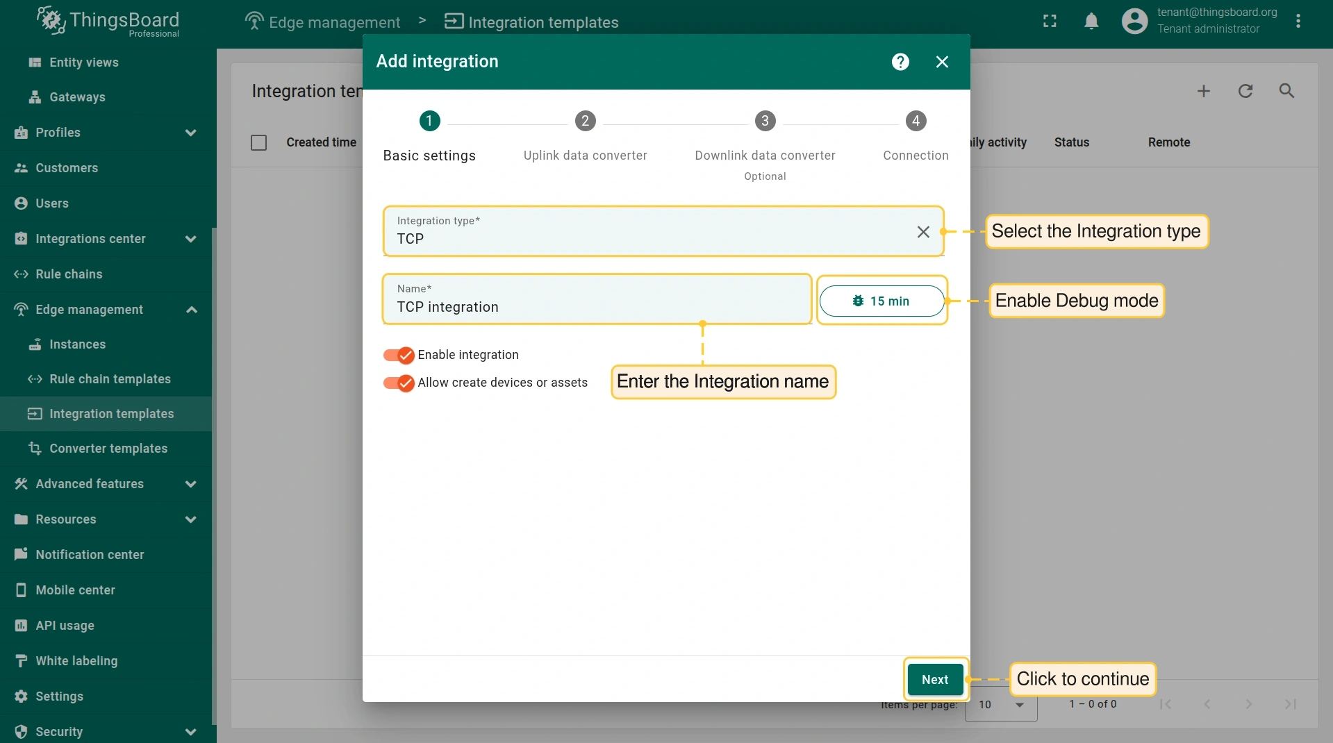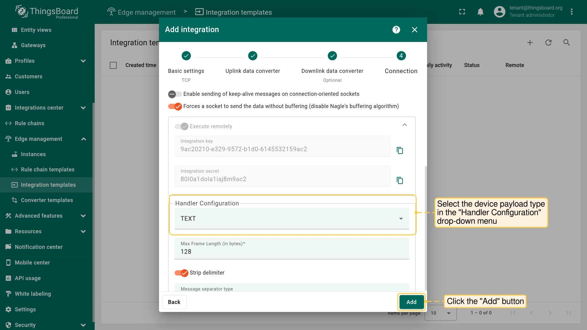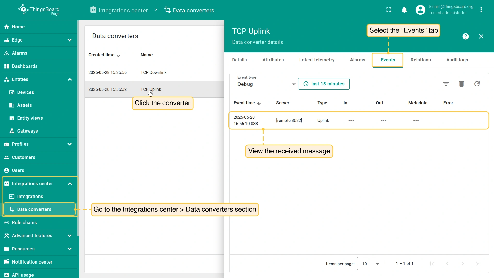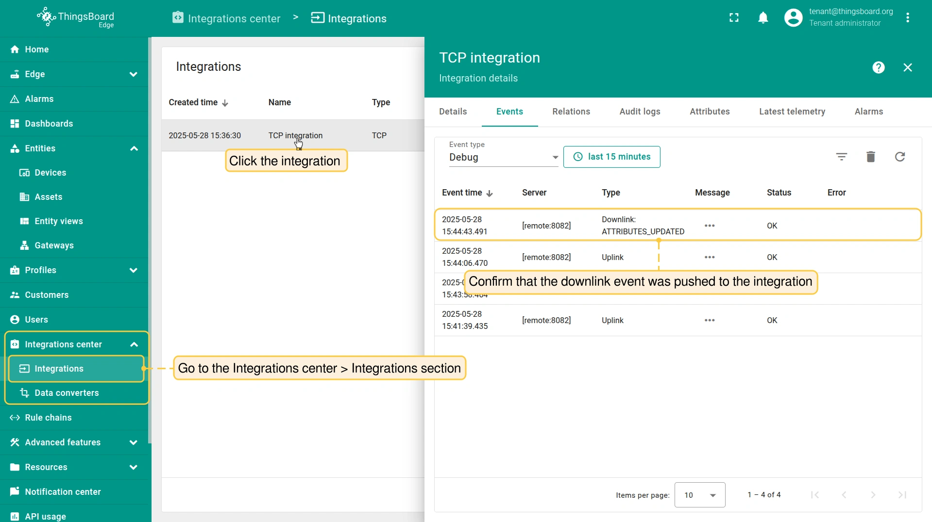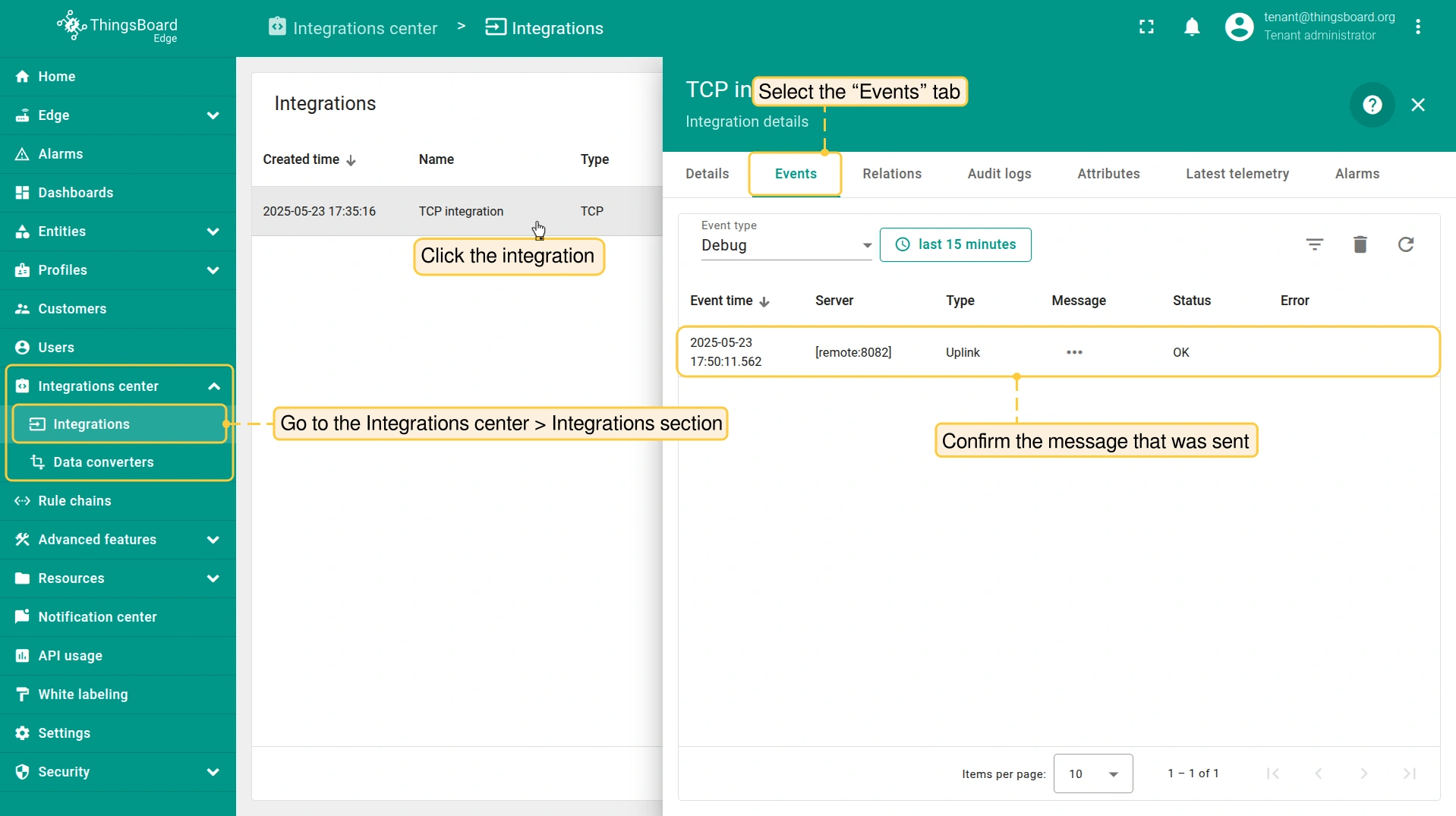 - Login to your ThingsBoard Edge instance and go to the Integrations center > Integrations section. Confirm the TCP integration on the Edge.