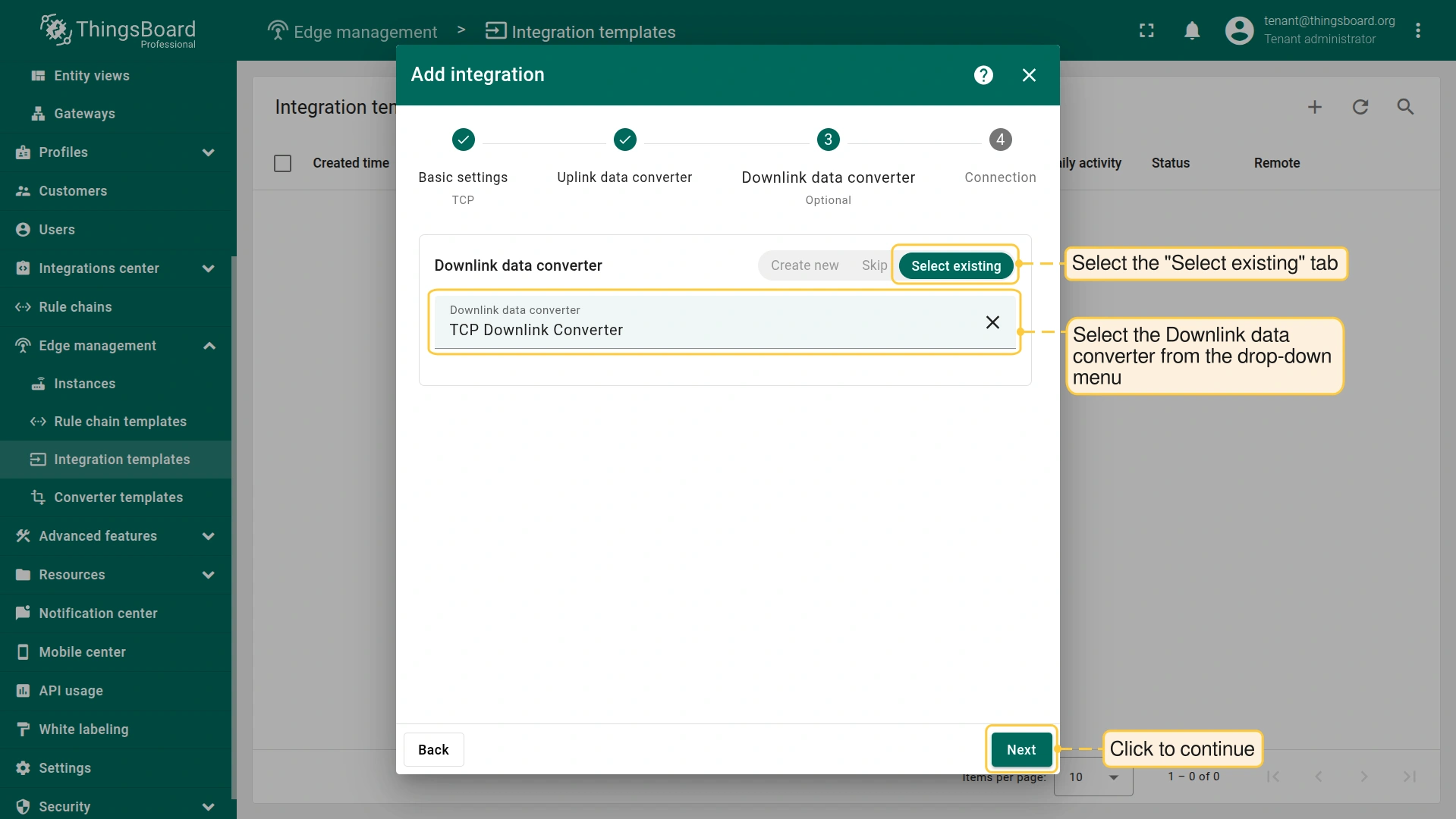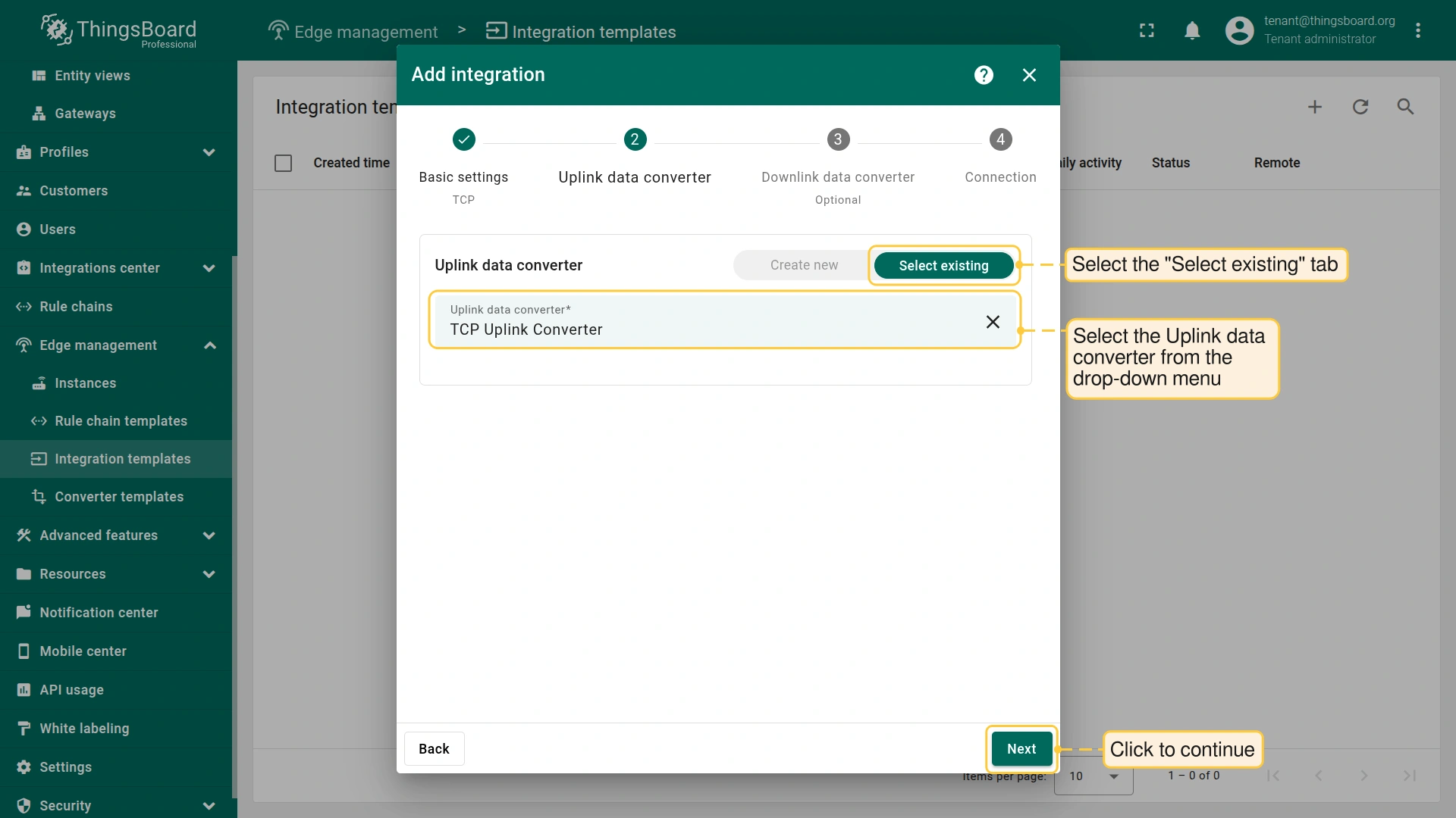 Now that the Uplink and Downlink converter templates have been created, it is possible to create the Integration: