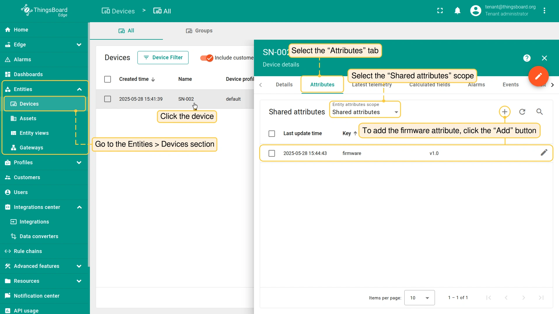 To check the downlink functionality. Let’s add the firmware shared attribute: