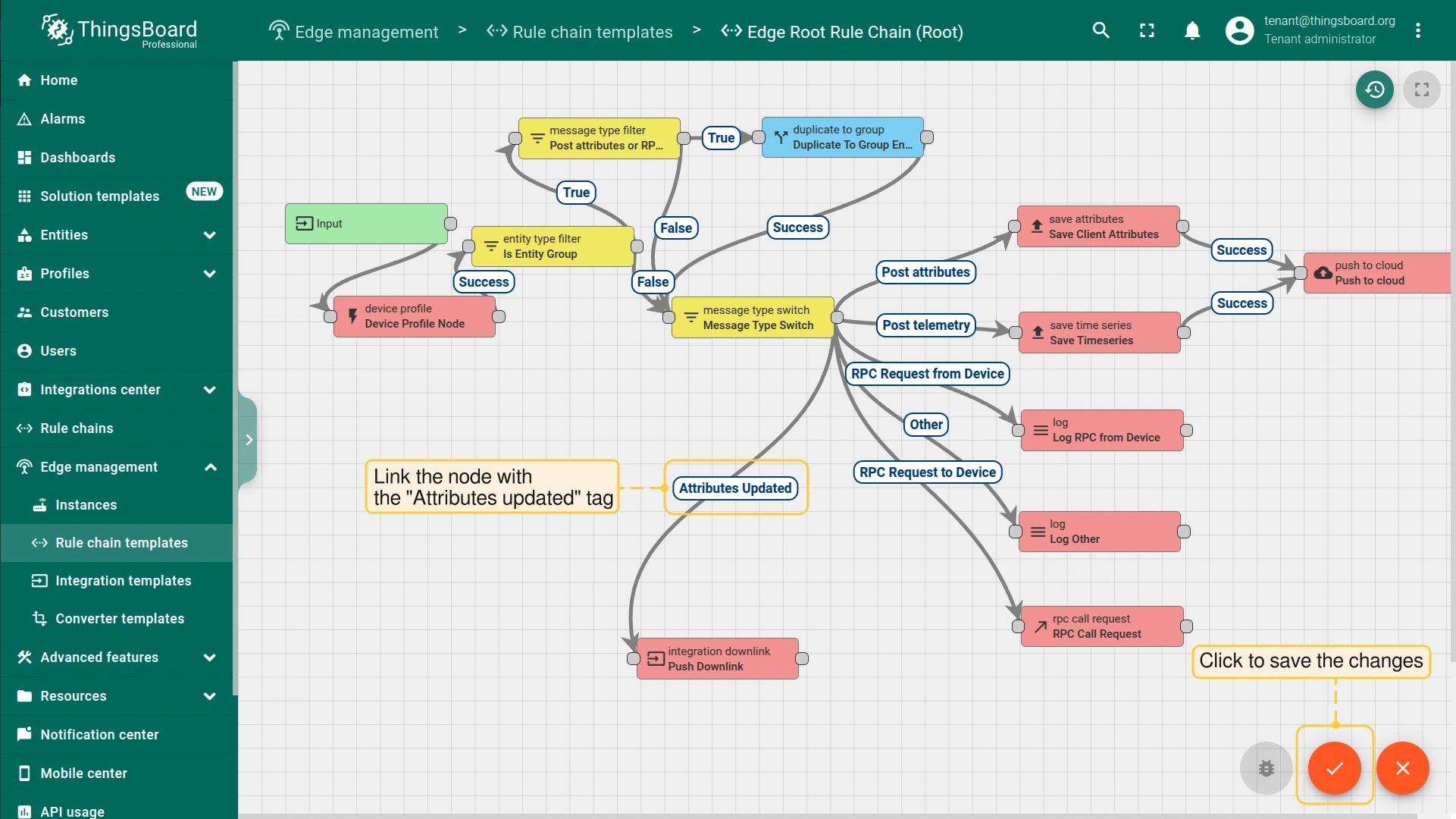 For example, create an integration downlink node and set the ‘Attributes updated’ link to it. When changes are made to the device attribute, the downlink message is sent to the integration.