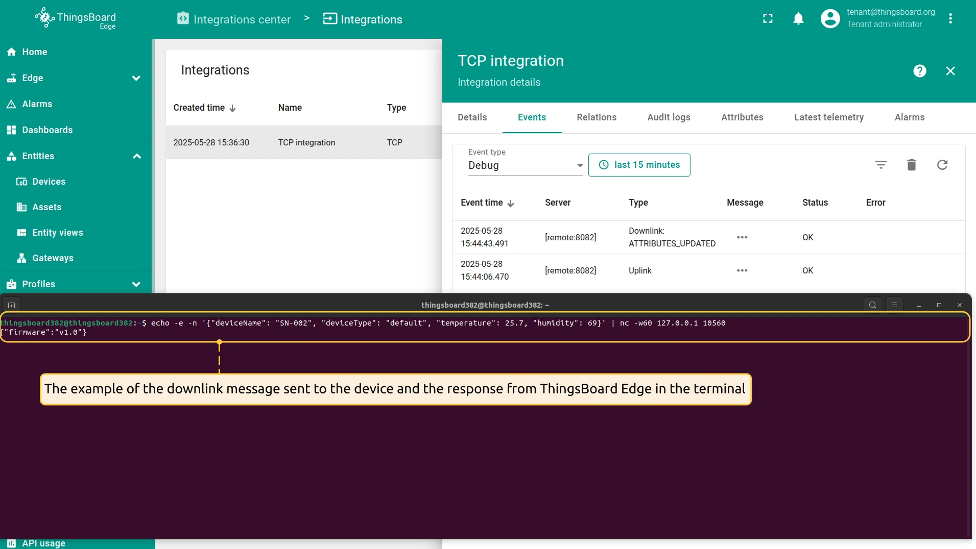 An example of the message sent to the device and the response from ThingsBoard Edge in the terminal: