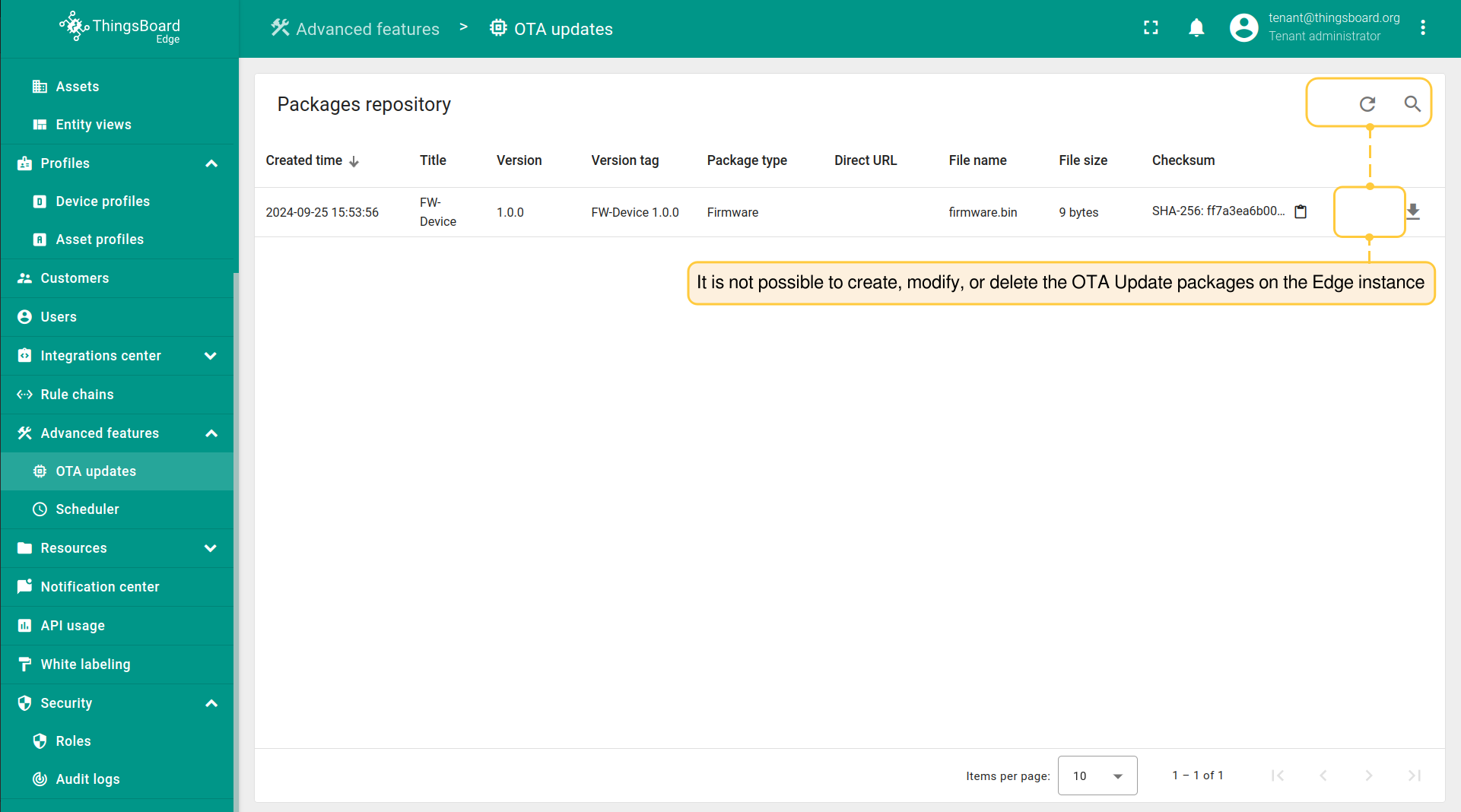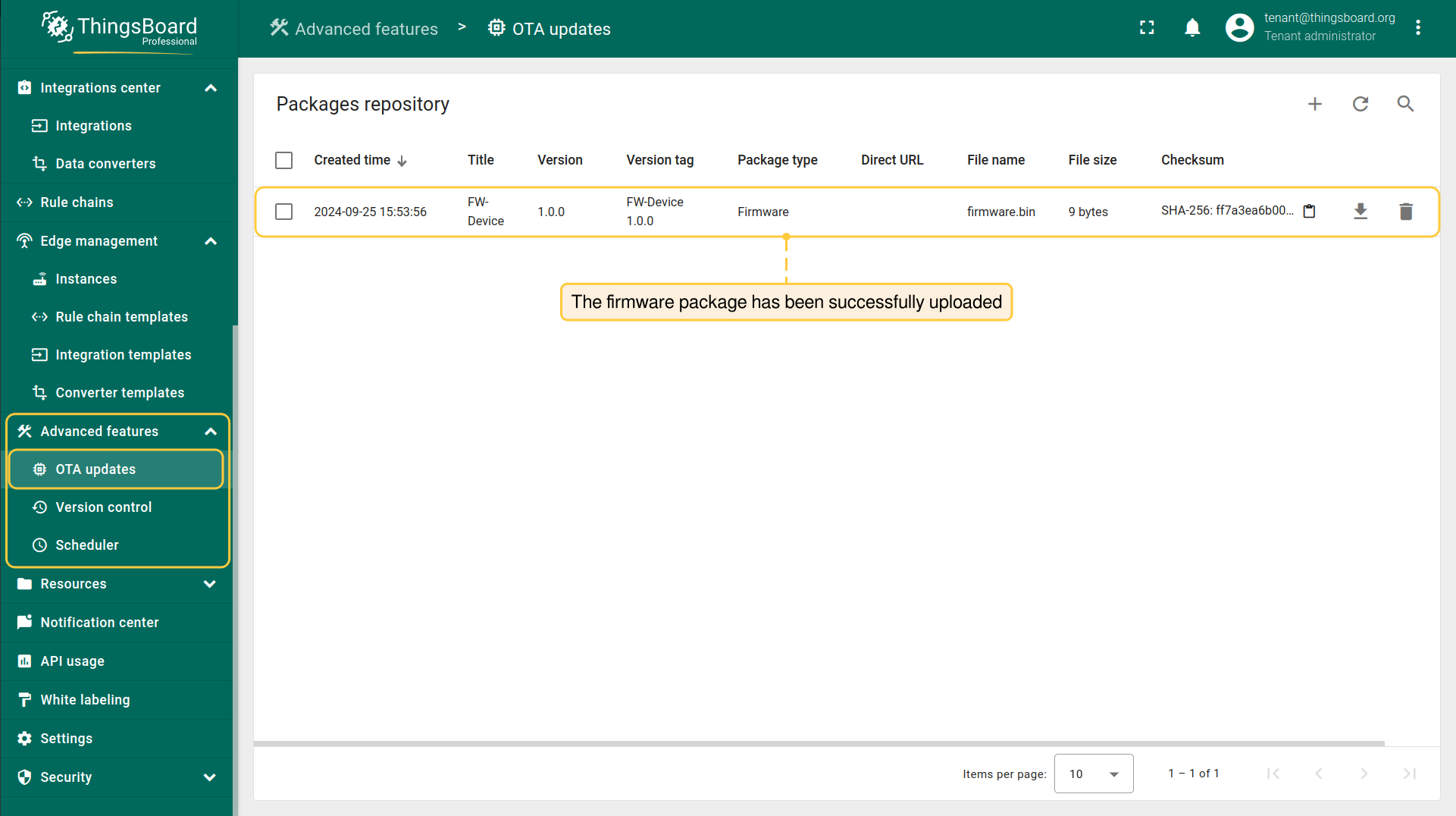 使用您的凭据登录ThingsBoard Edge实例,并进入Advanced features > OTA updates区域。以确认固件包已在Edge实例上成功配置。