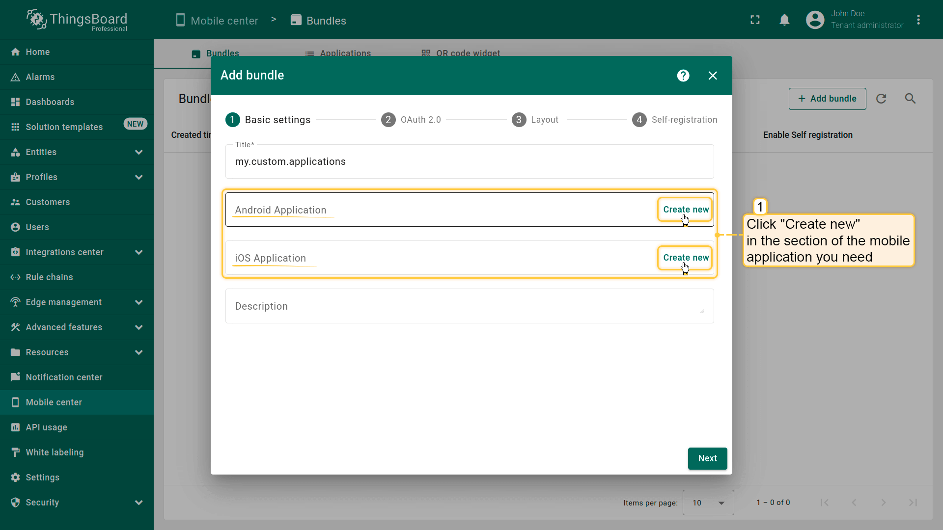 - 在相应部分(Android Application或iOS Application)点击”创建新“。