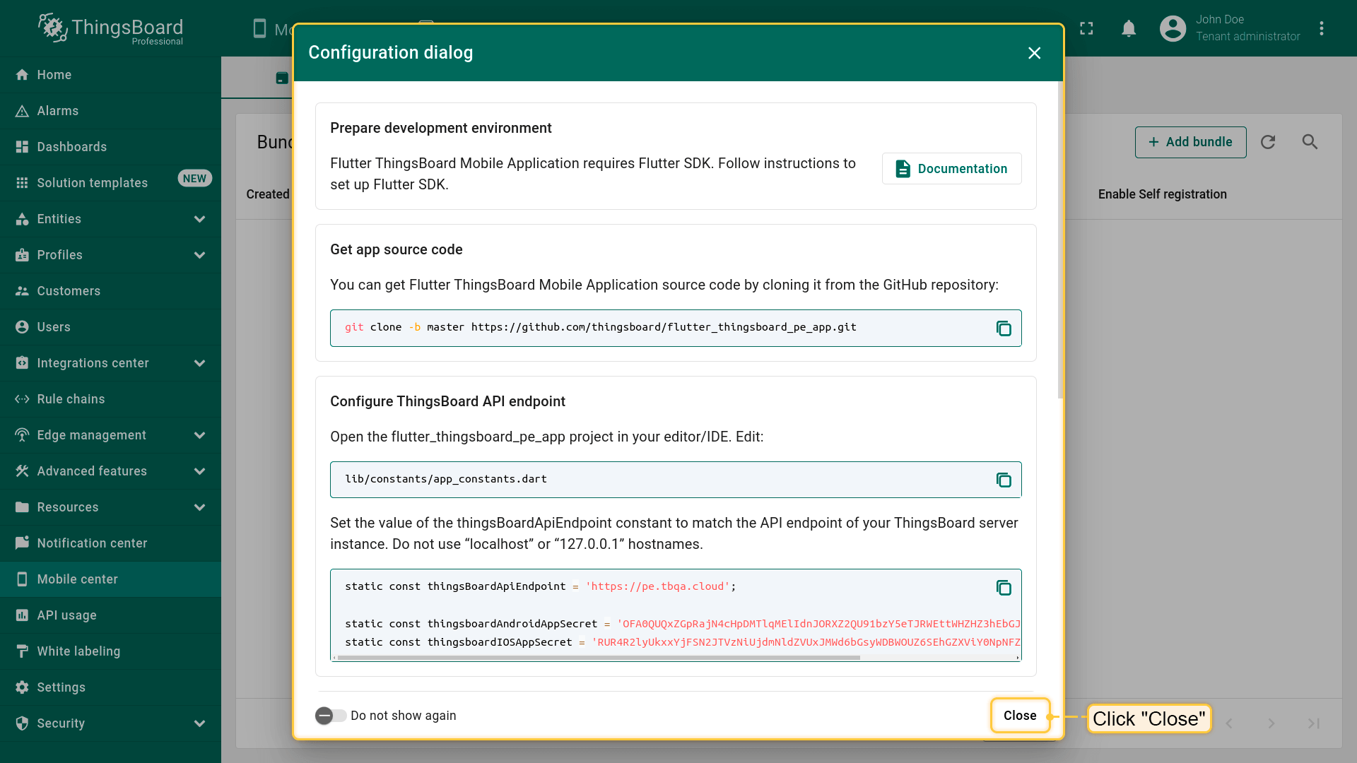 接下来会打开配置对话框。请根据提示继续配置新移动应用。 如果您已有ThingsBoard PE Mobile Application,可直接点击”关闭“。