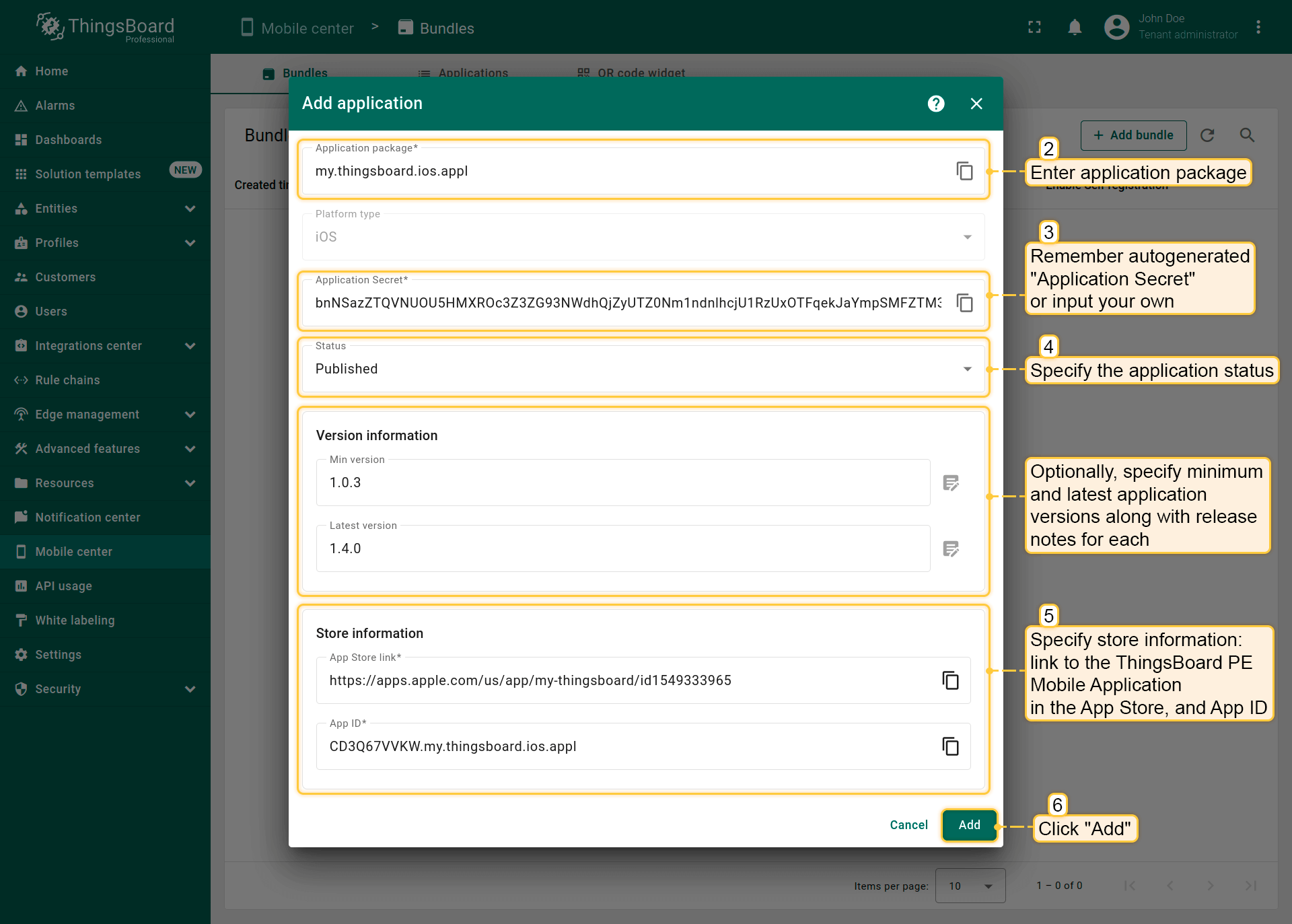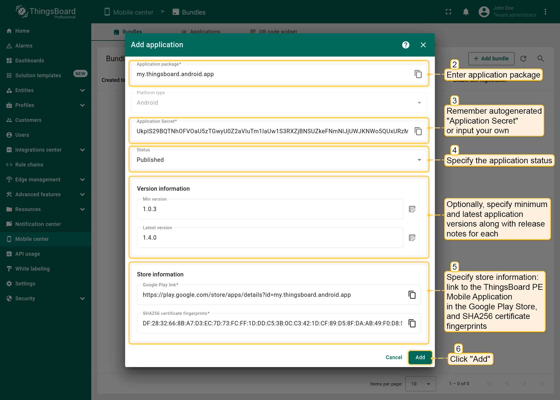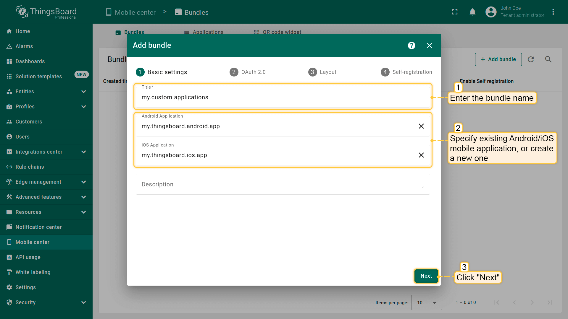 - 应用URL主机名:定义重定向URL中的主机名部分,例如app.pe.thingsboard.org。