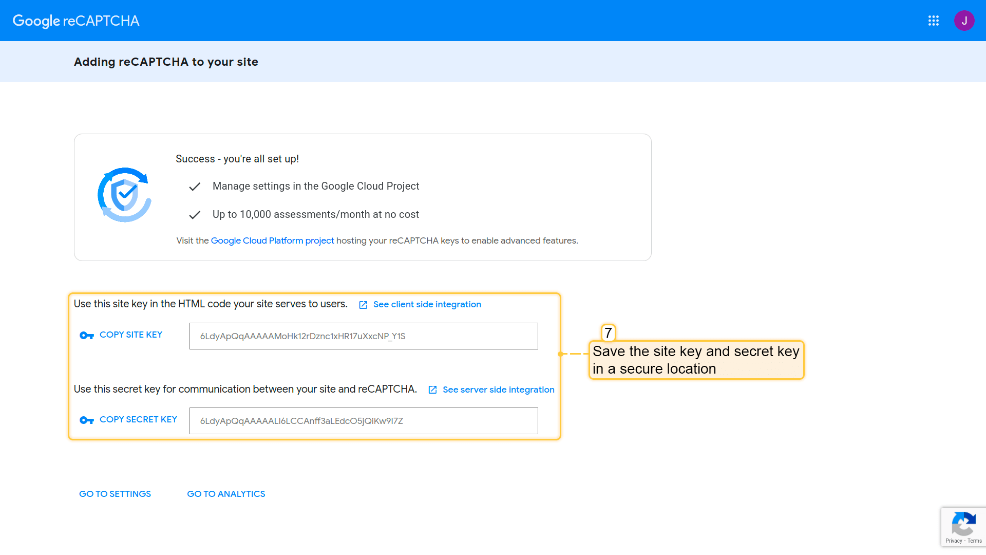 - 复制并安全存储site key和secret key。