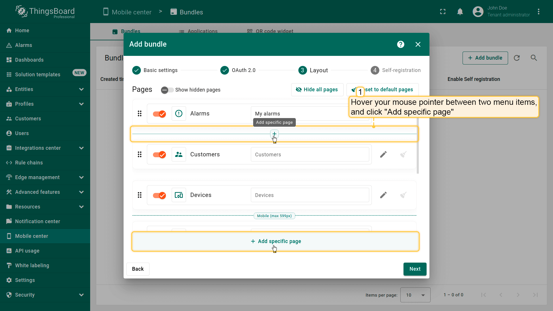 - 点击页面底部或现有菜单项之间的”+ 添加特定页面“按钮;