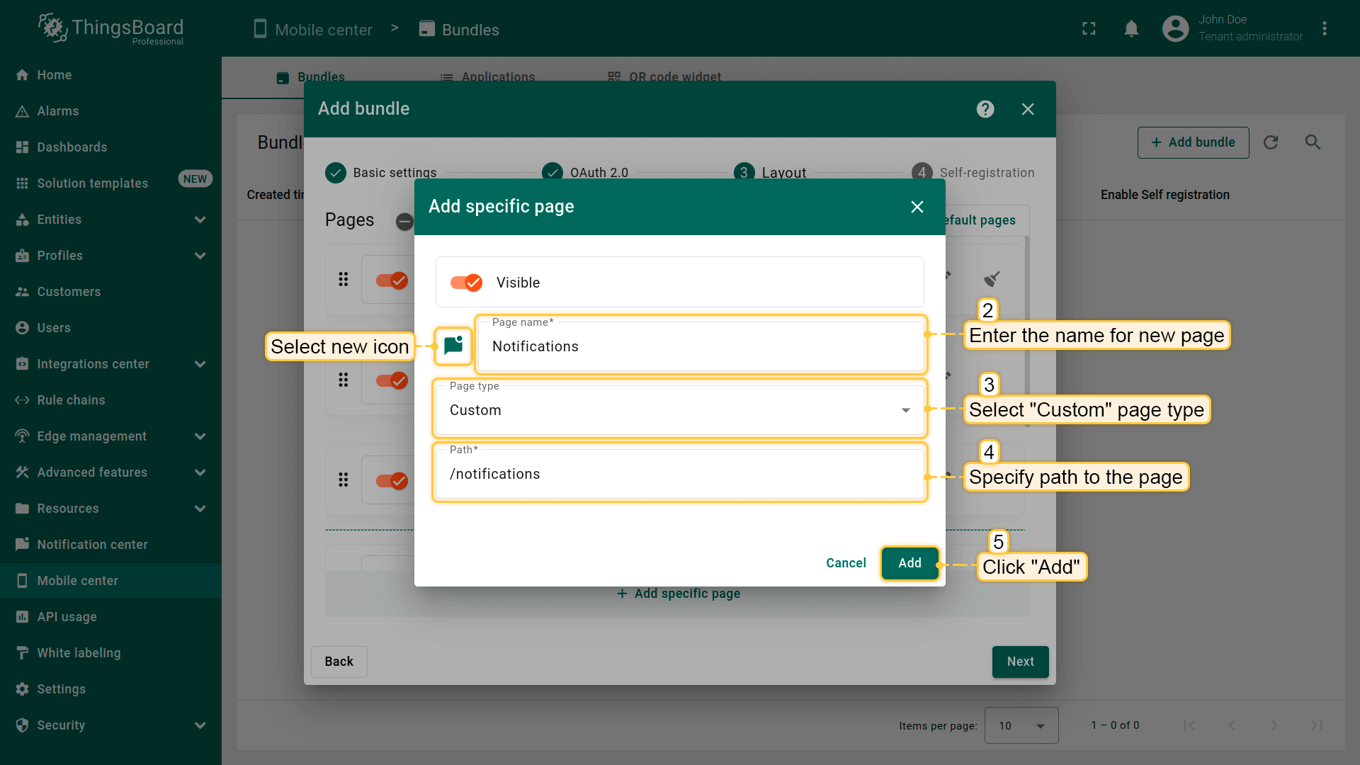 根据所选页面类型,指定仪表板或外部网页链接,或选择ThingsBoard菜单项;