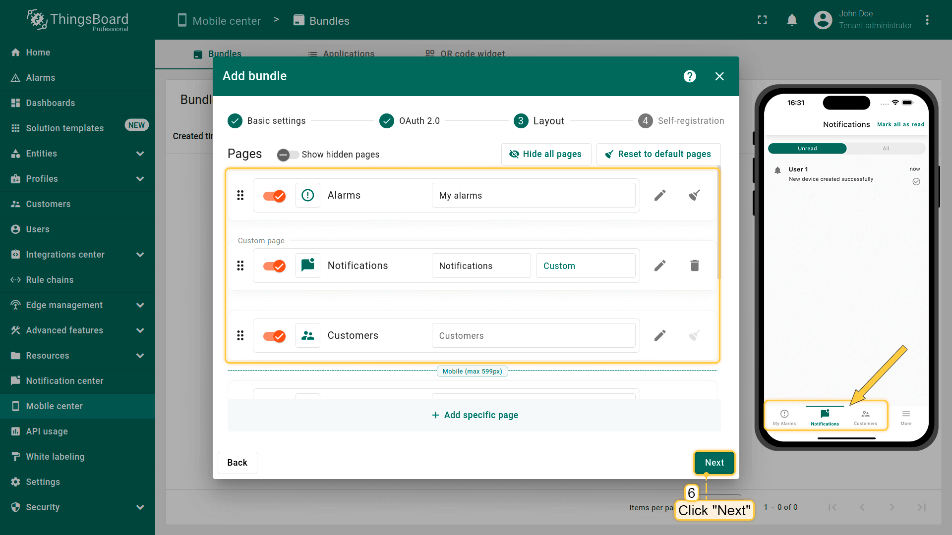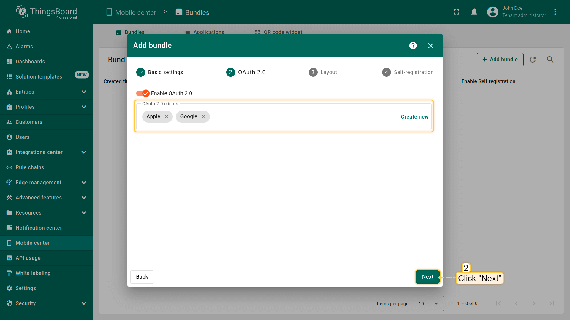 通过支持OAuth 2.0协议的外部提供方,为ThingsBoard PE Mobile Application用户添加认证能力。 为此,指定已配置的OAuth 2.0客户端或配置新客户端。完成OAuth 2.0配置后,点击”下一步”。