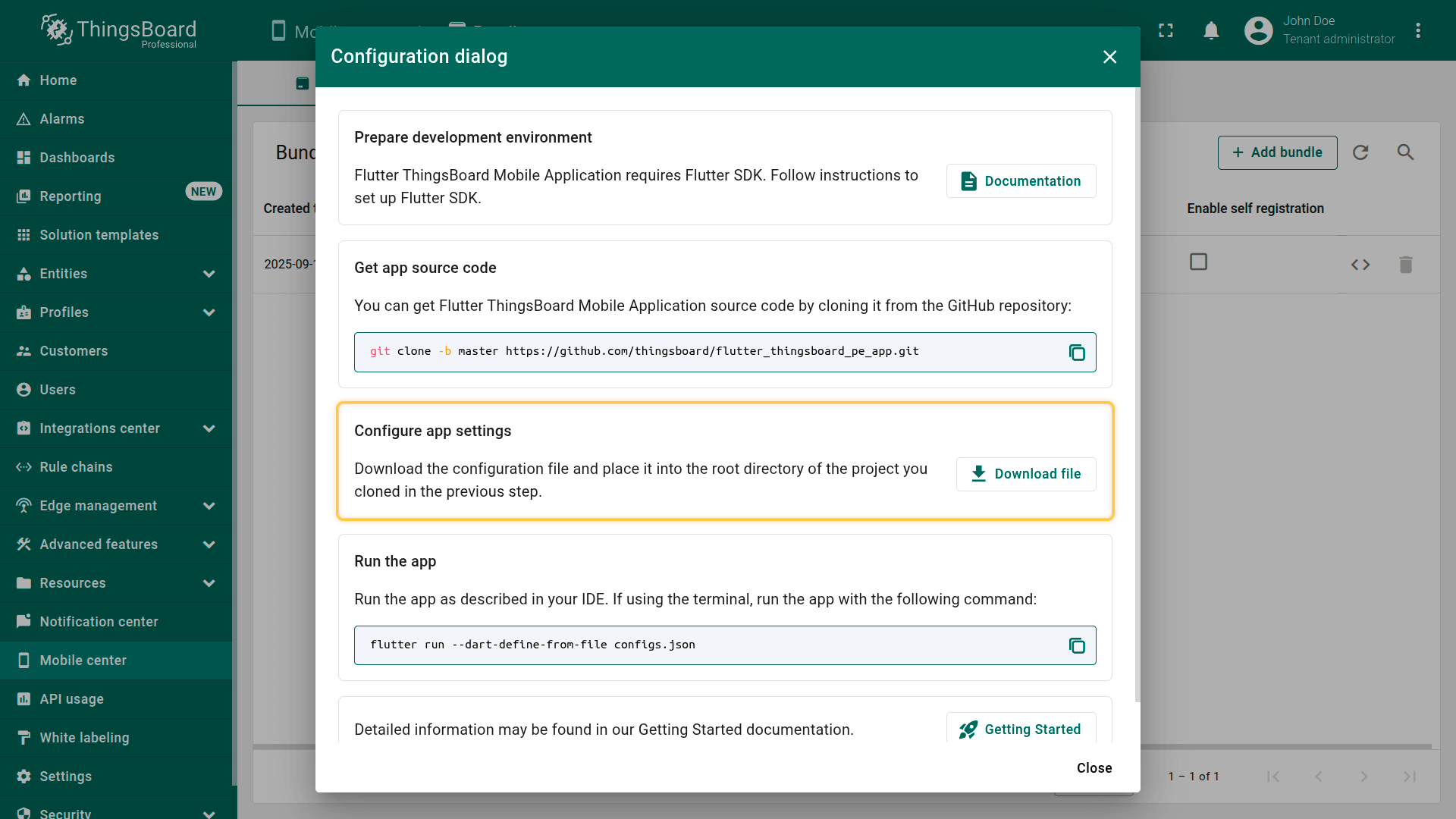 从移动中心下载的JSON文件加载ThingsBoard PE移动应用配置,确保应用使用正确的生产环境设置。