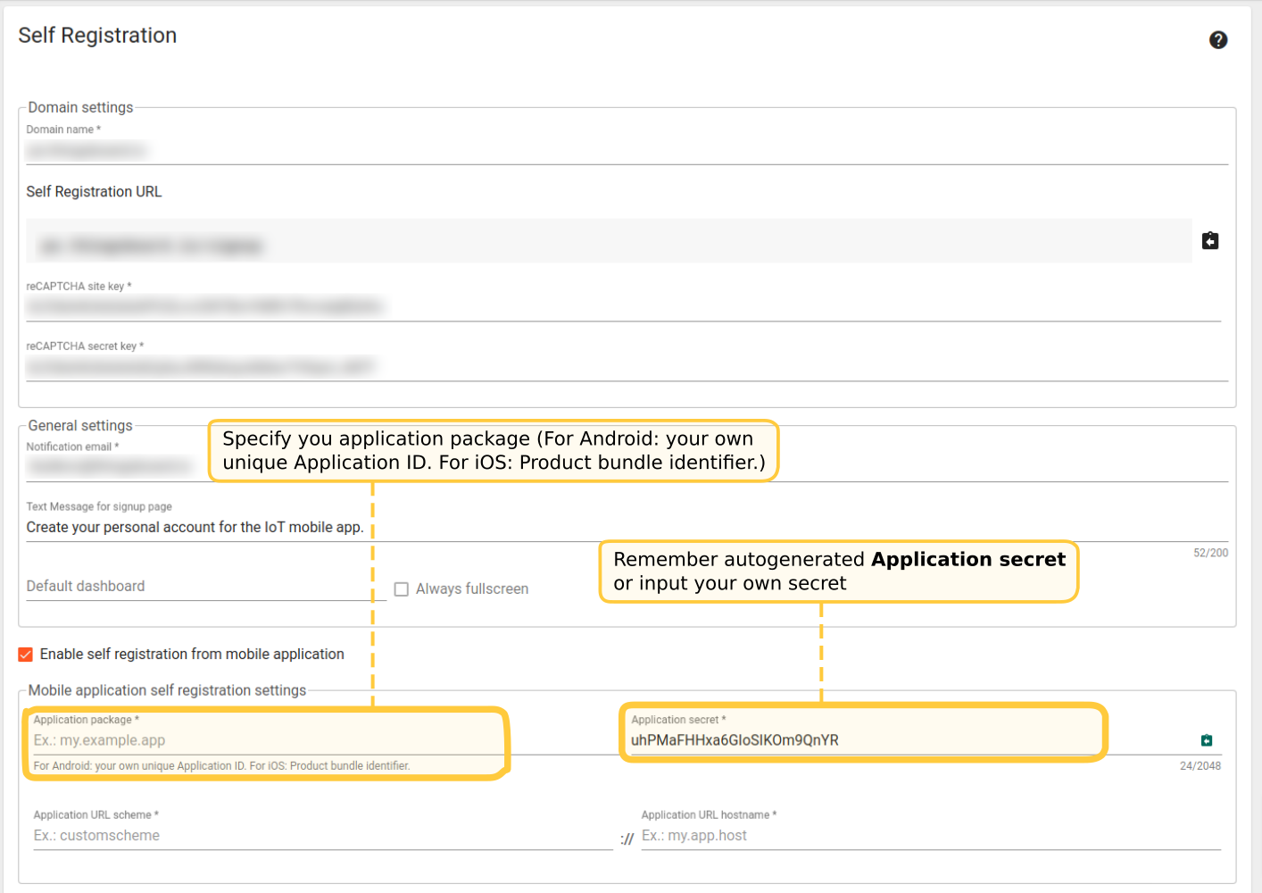 - Check Enable self registration from mobile application checkbox;