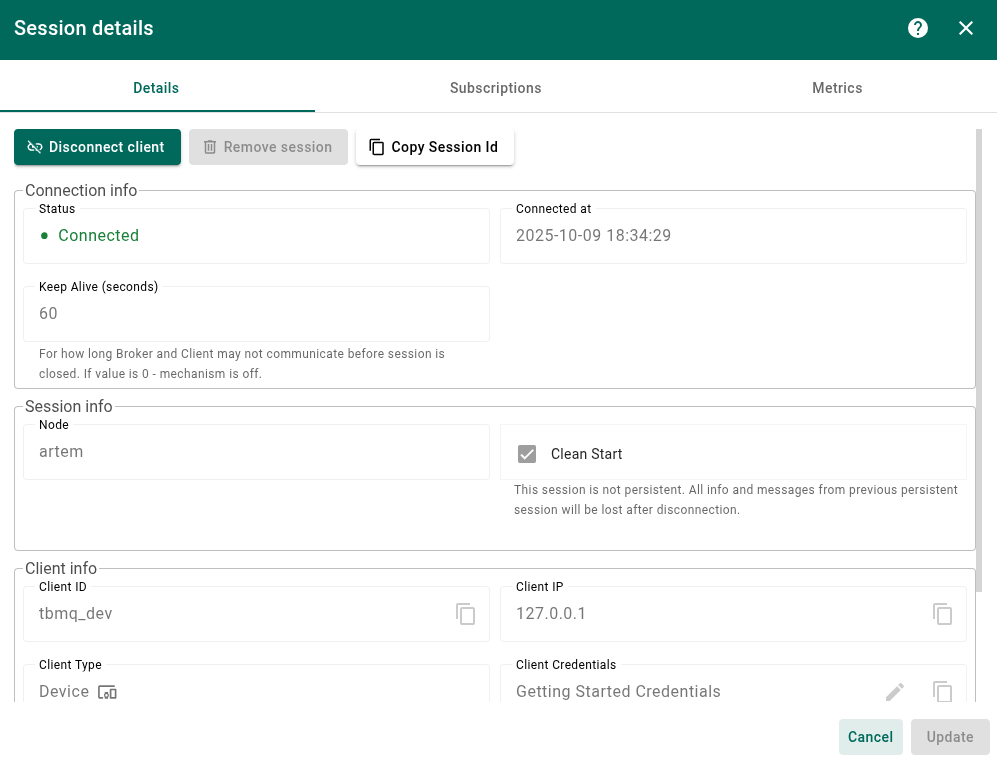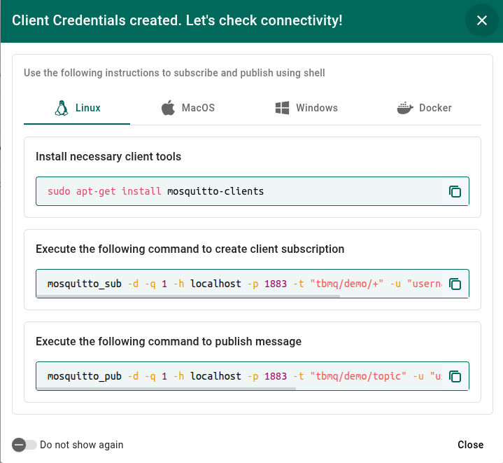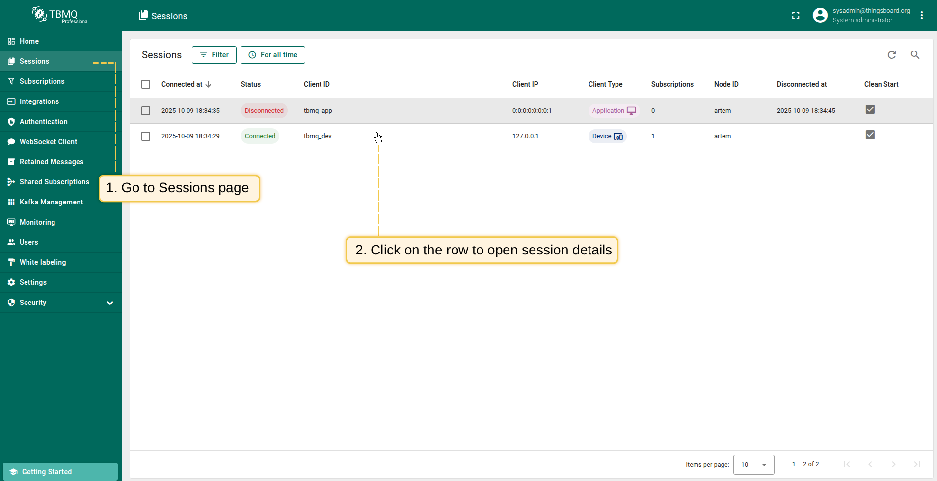 使用上述凭据,您可以立即开始发布和订阅topic。 要访问TBMQ UI并查看会话、订阅和其他功能,请注册免费账户。