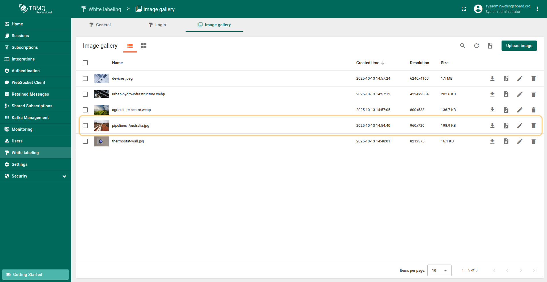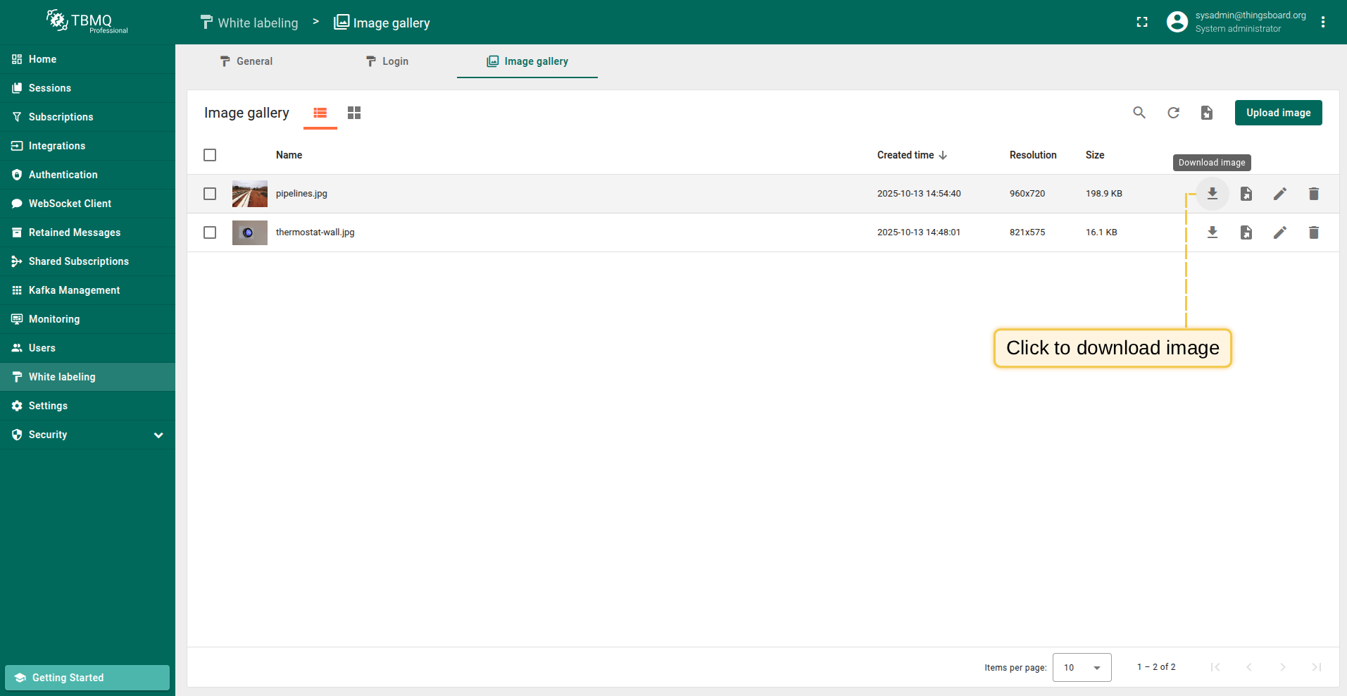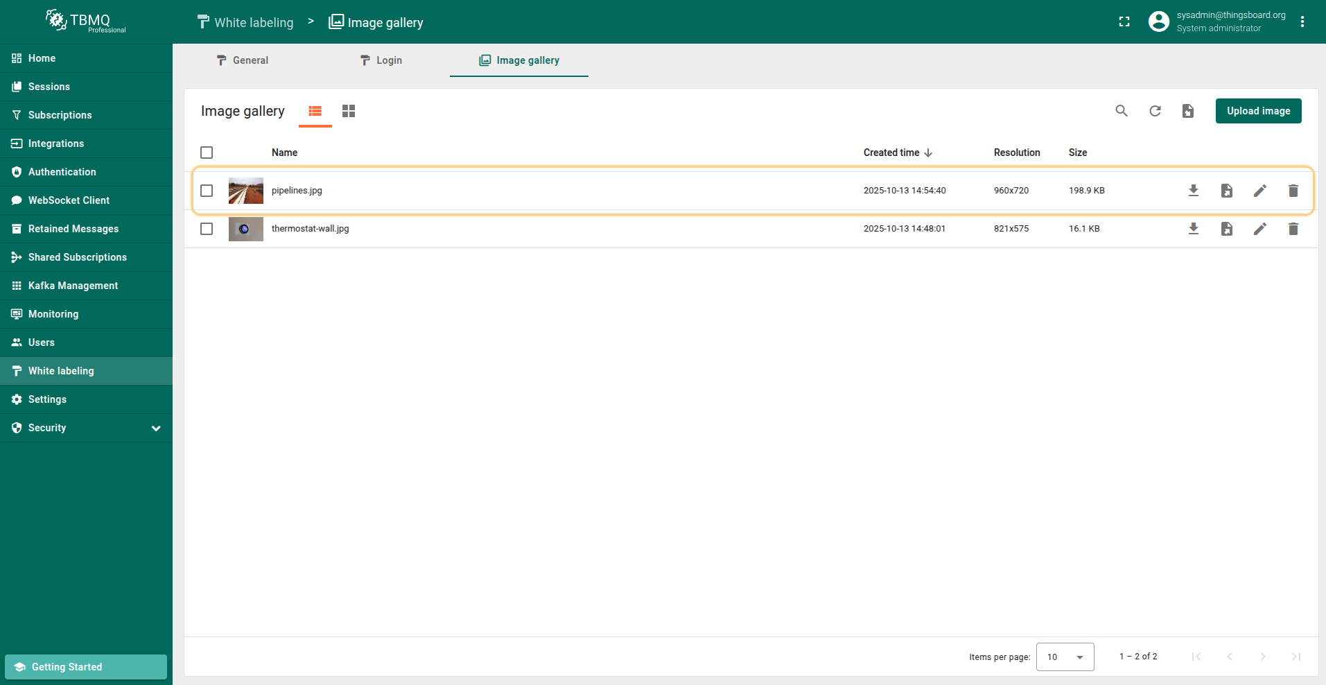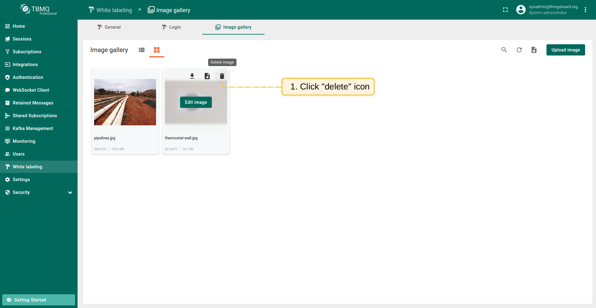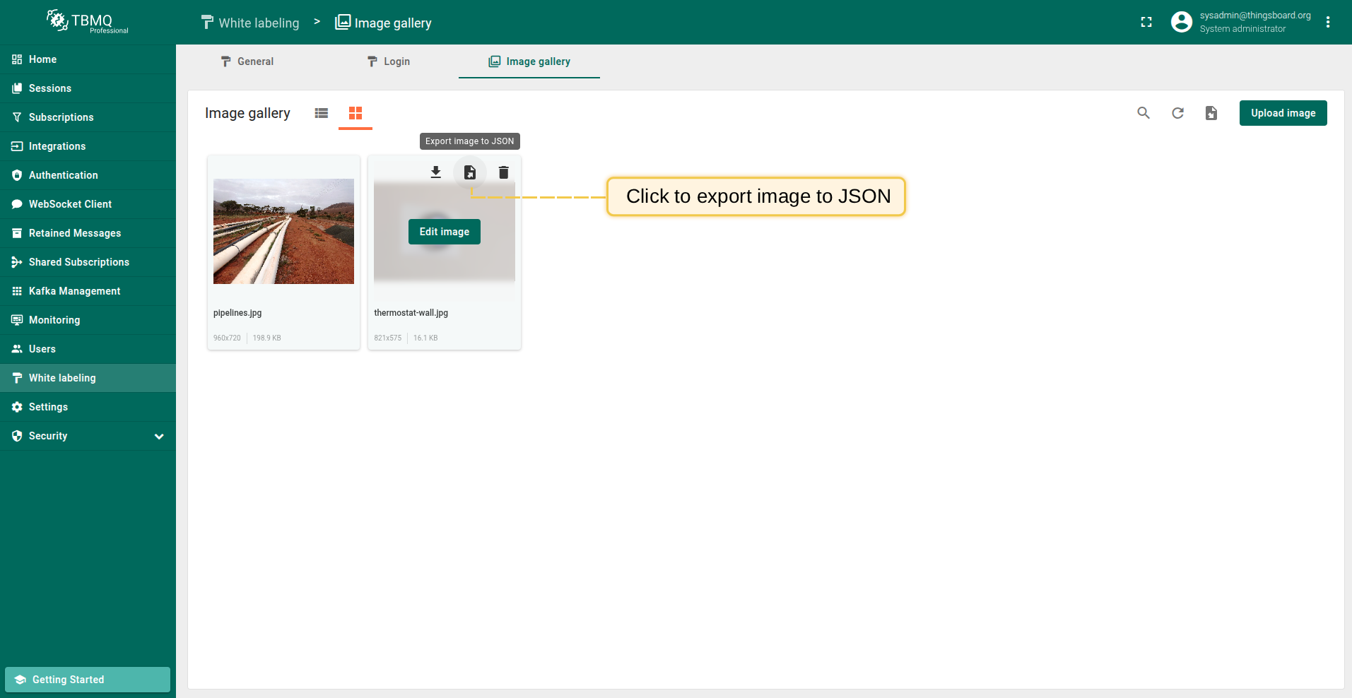 Go to the "White labeling" page and click on the "Image gallery" tab. Then, click the “Upload image” button in the top right corner of the screen;