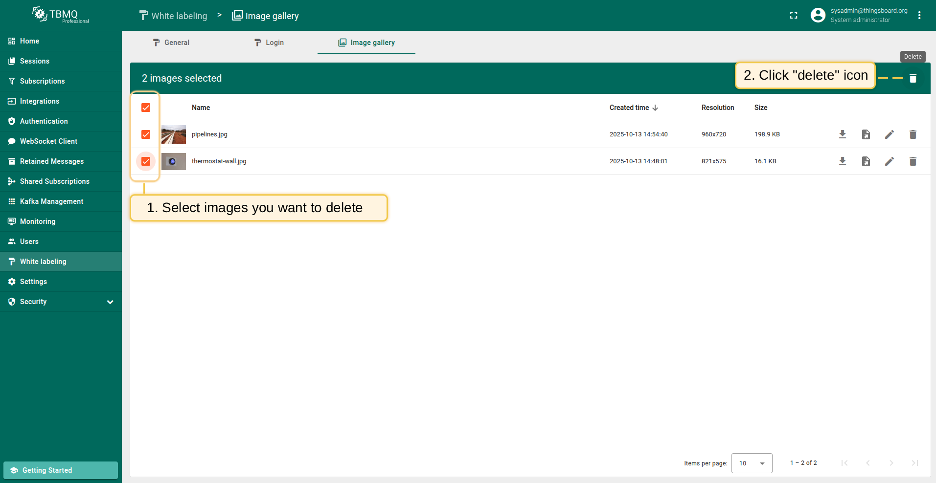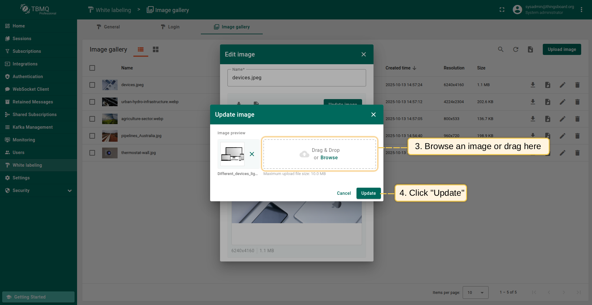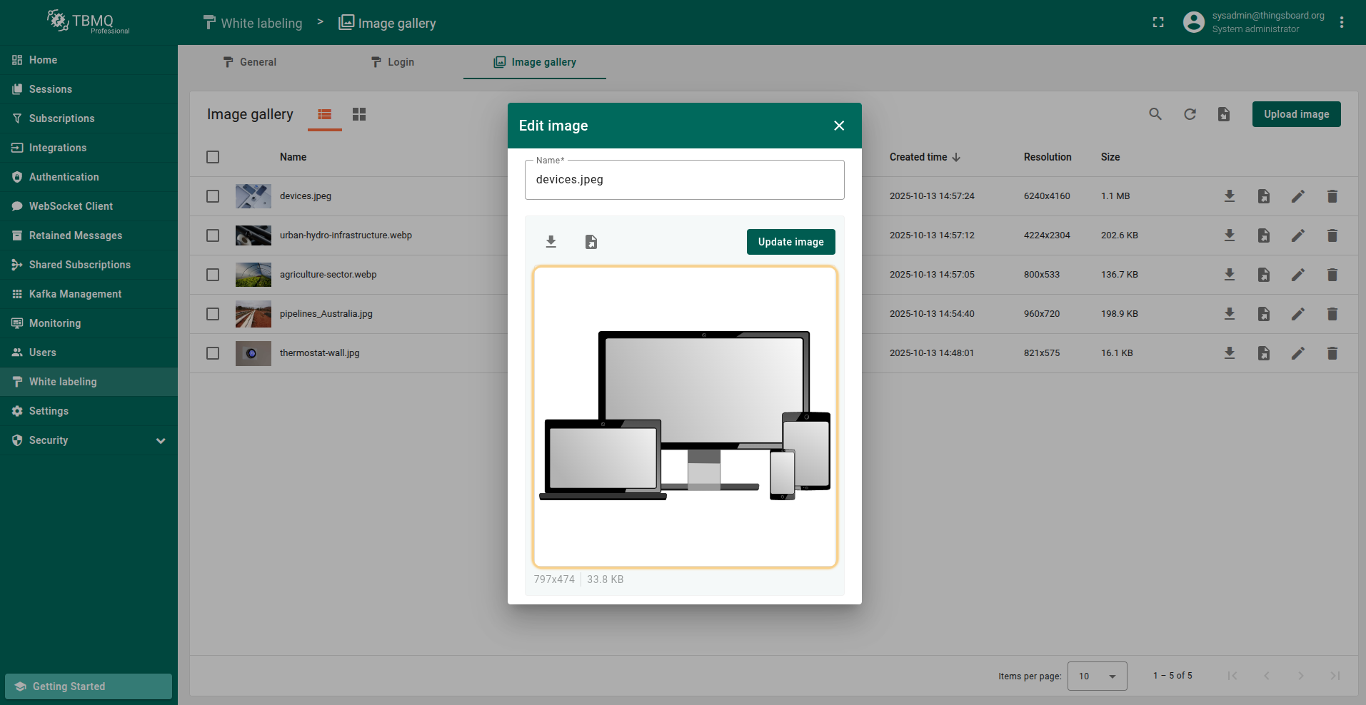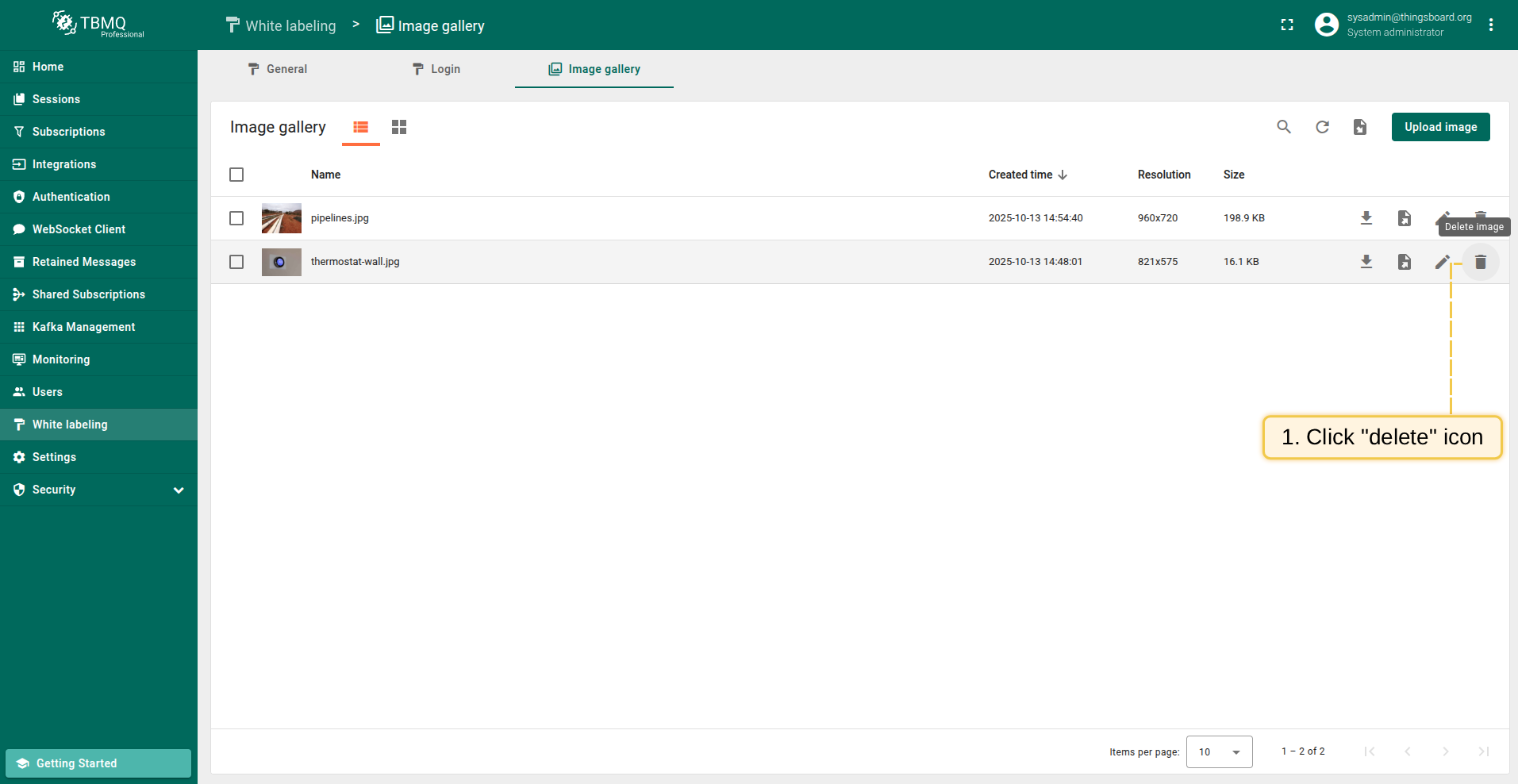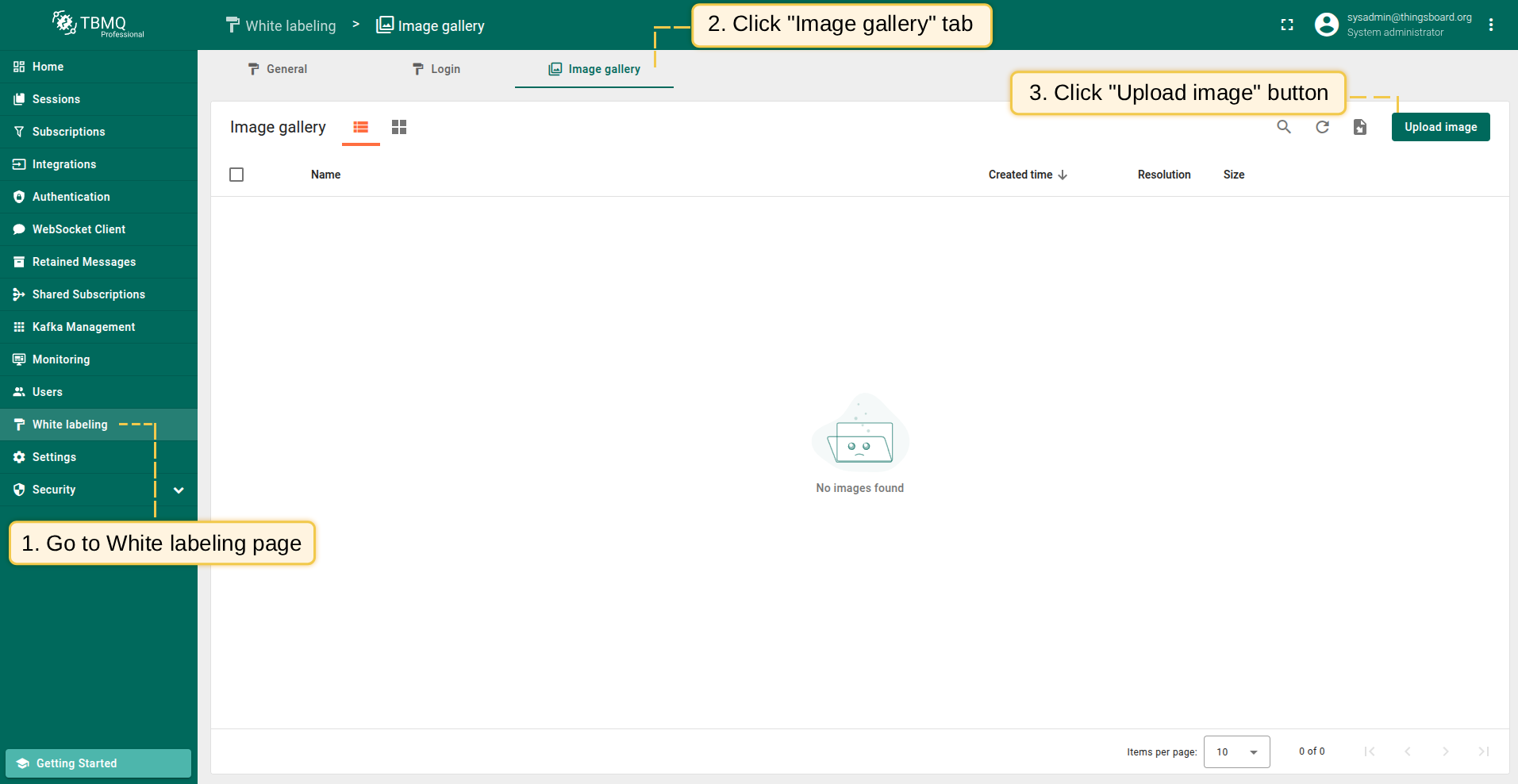 Go to the "White labeling" page and click on the "Image gallery" tab. Then, click the “Upload image” button in the top right corner of the screen;
