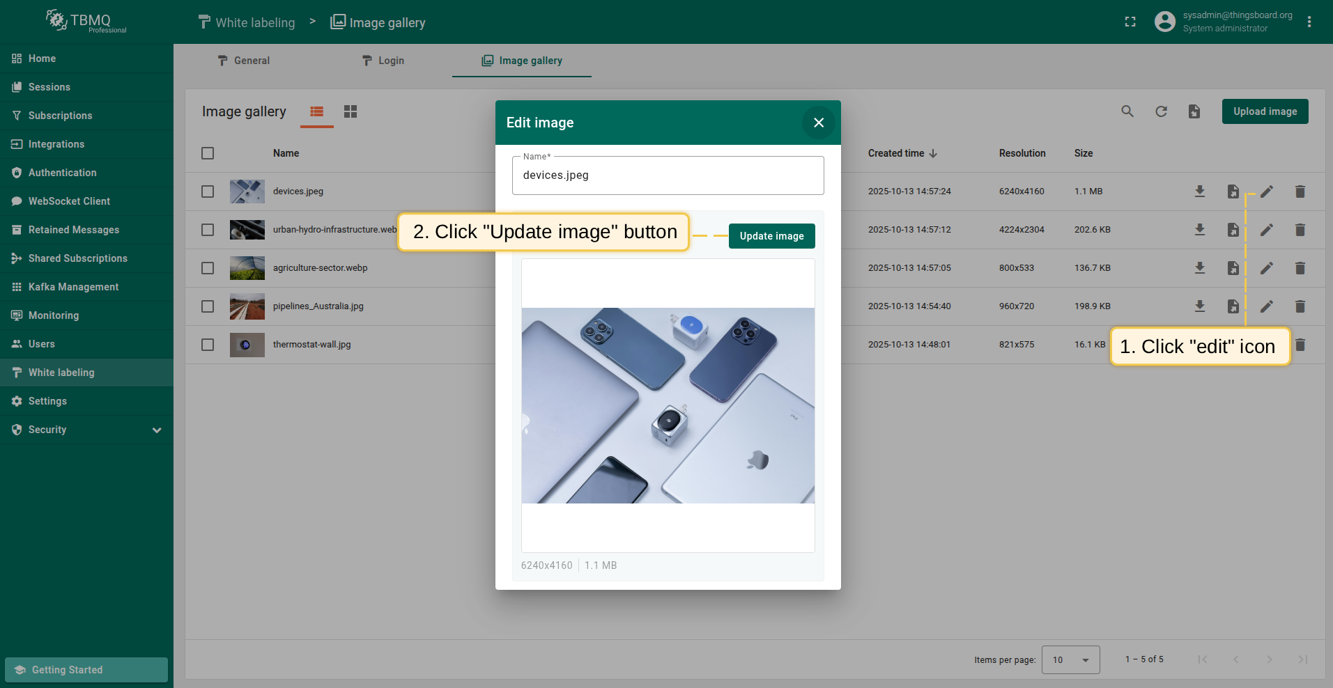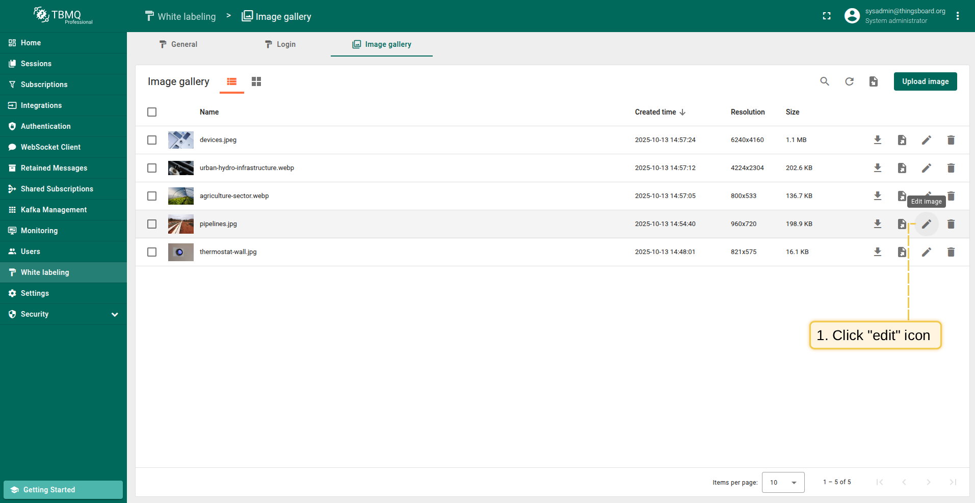 To open editing an image window, click the "Edit image" icon next to the image name that you want to edit;