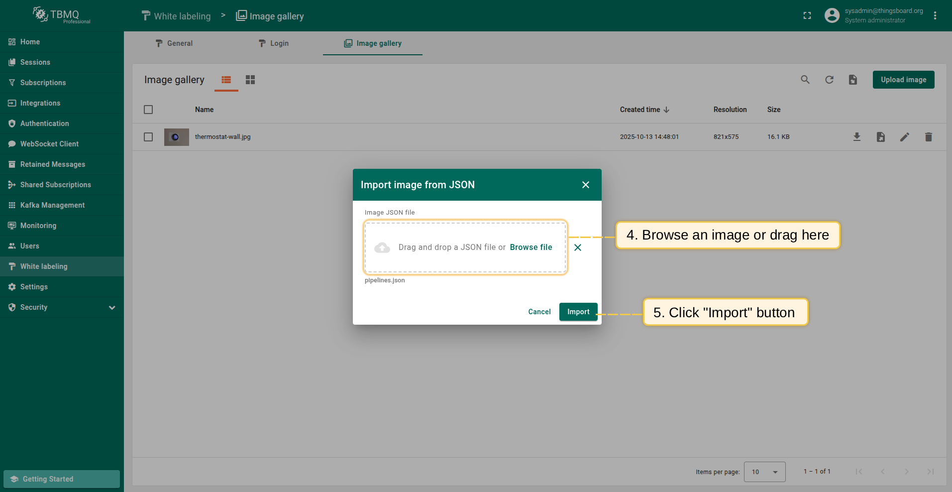 In the "Import image" window, upload a JSON image file and click "Import";