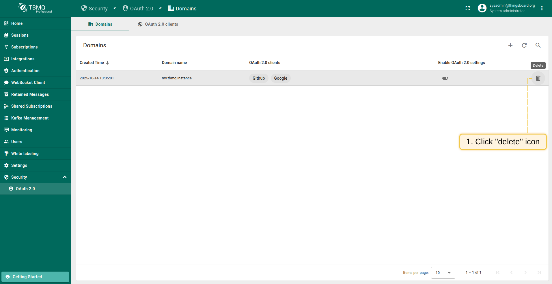 - 点击要删除域名行的“垃圾桶”图标;
