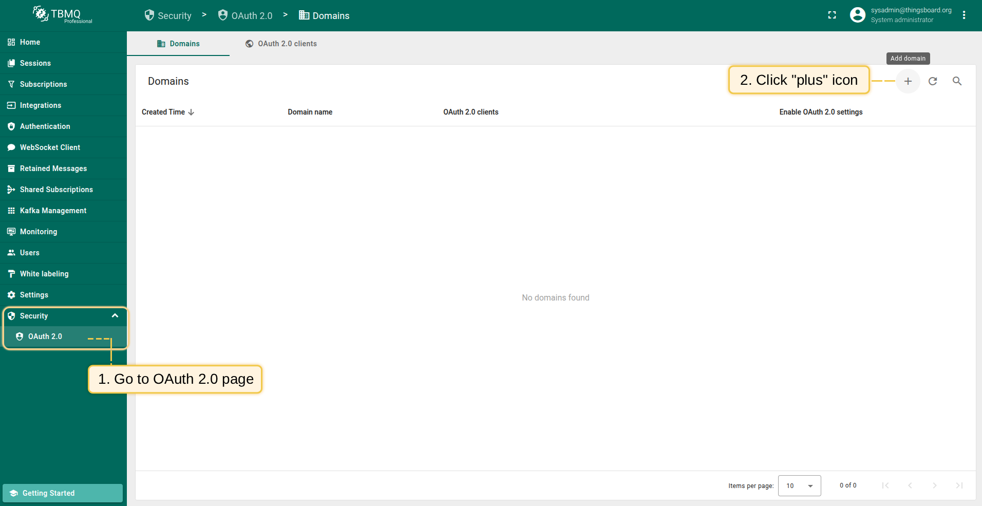 - 进入”OAuth 2.0”页的”Domains”选项卡,点击”+”图标;