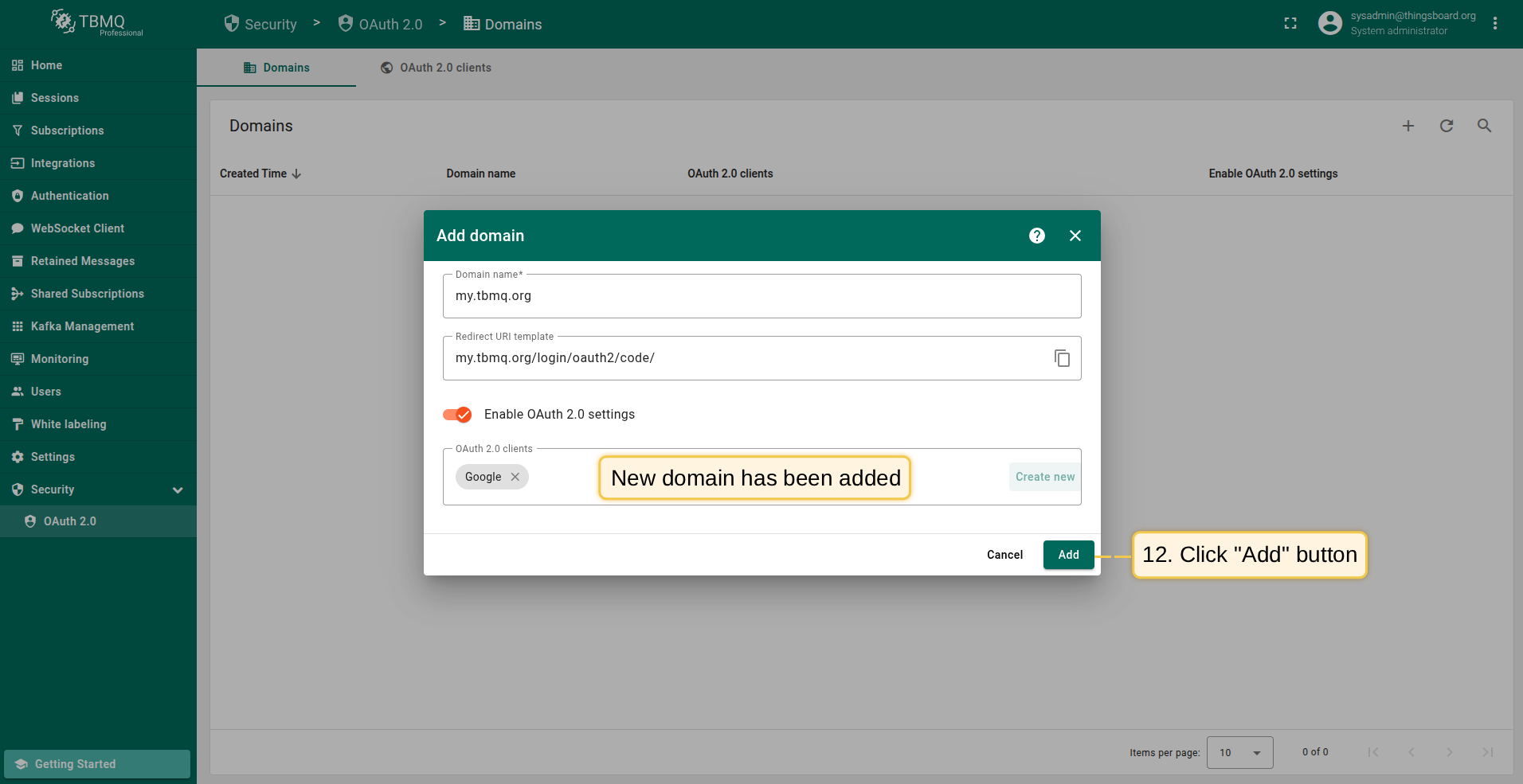 - OAuth客户端已成功添加。再次点击“添加”确认域名添加。