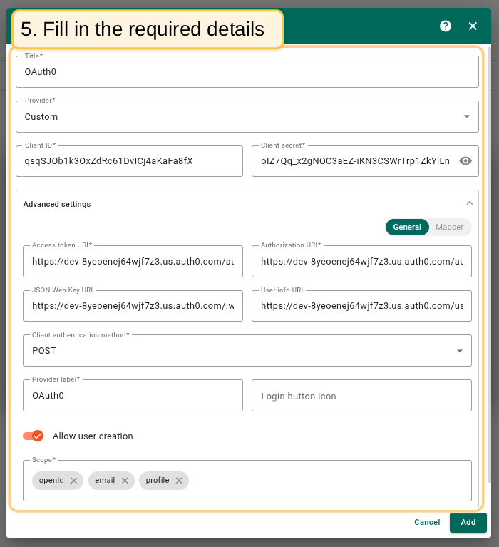 - 填写从认证提供商获取的Client ID和Client Secret;