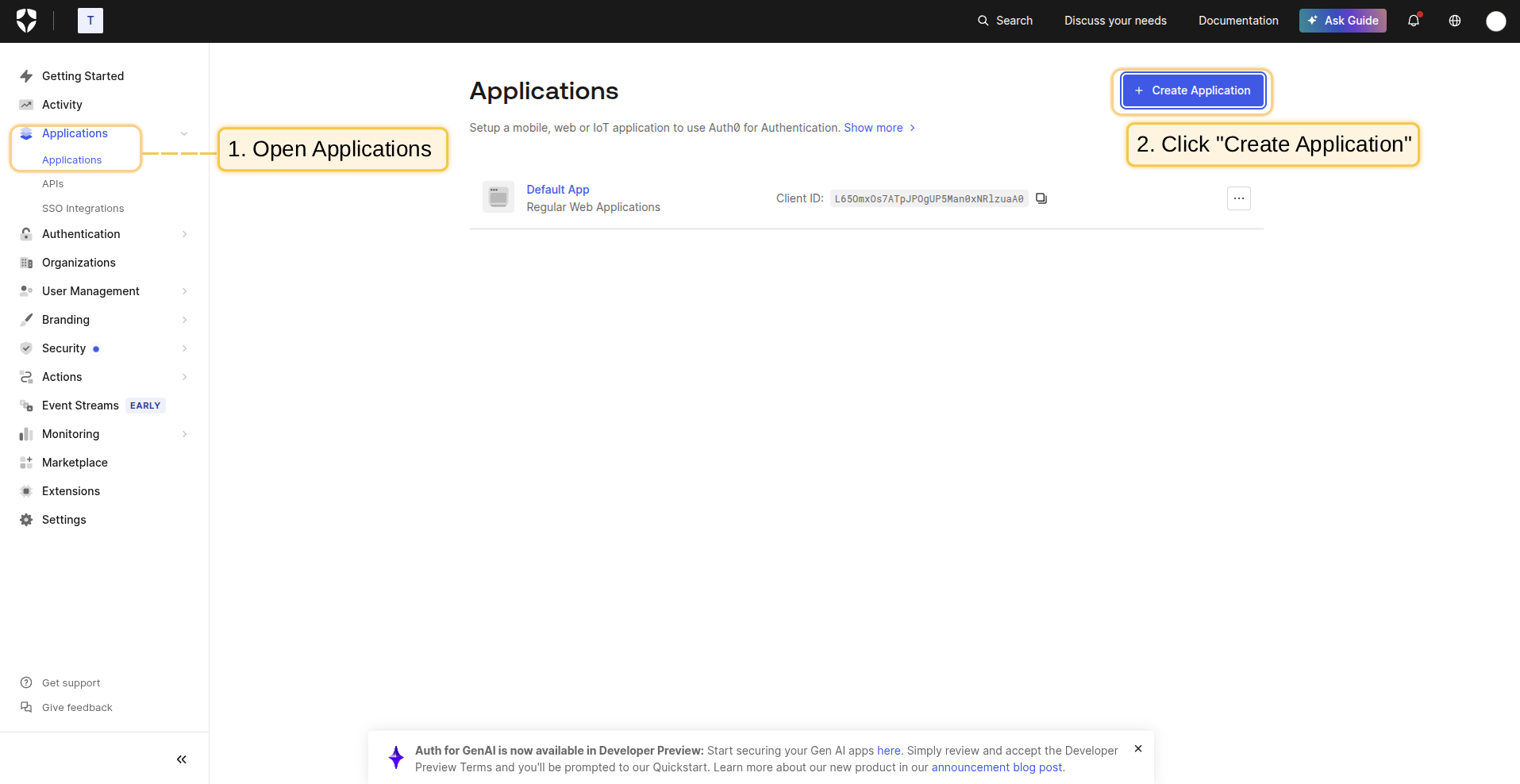 - 进入Auth0管理控制台。打开”Applications”页面,点击”+ Create Application”按钮;