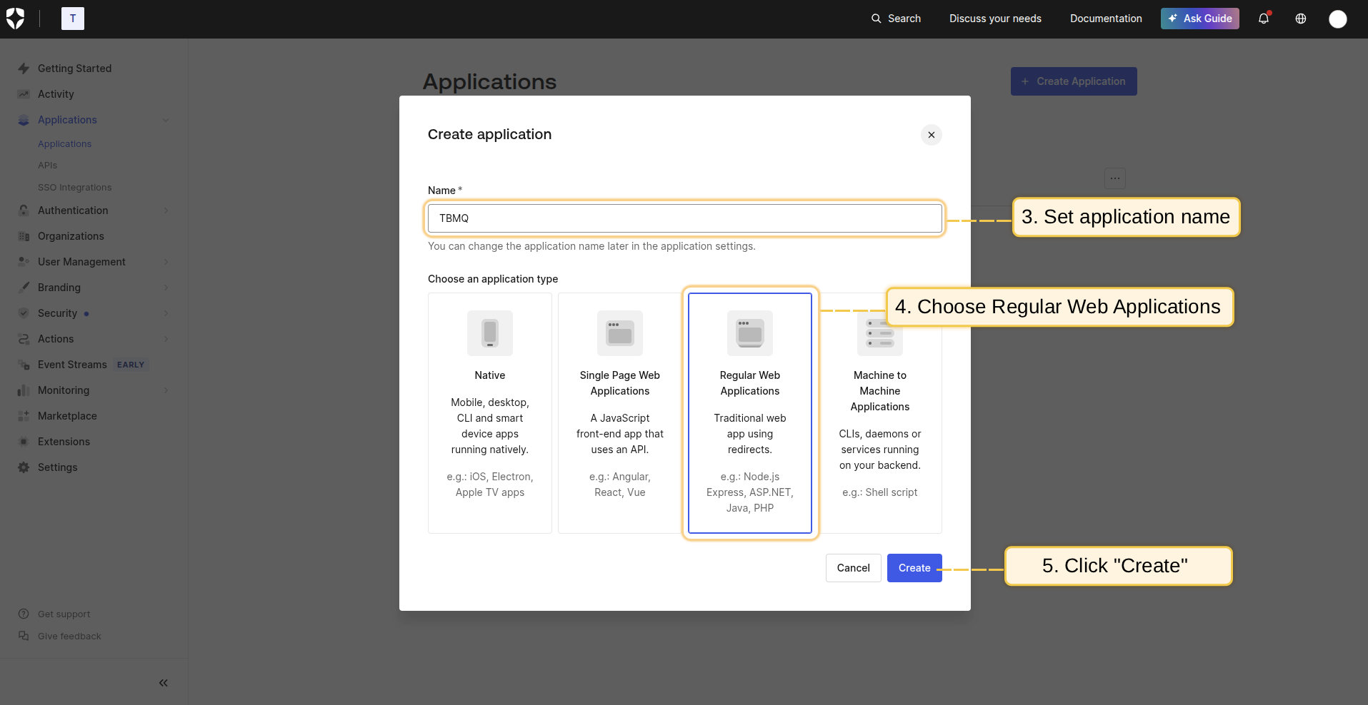 - 将应用程序命名为”TBMQ”,选择应用程序类型为Regular Web Applications;