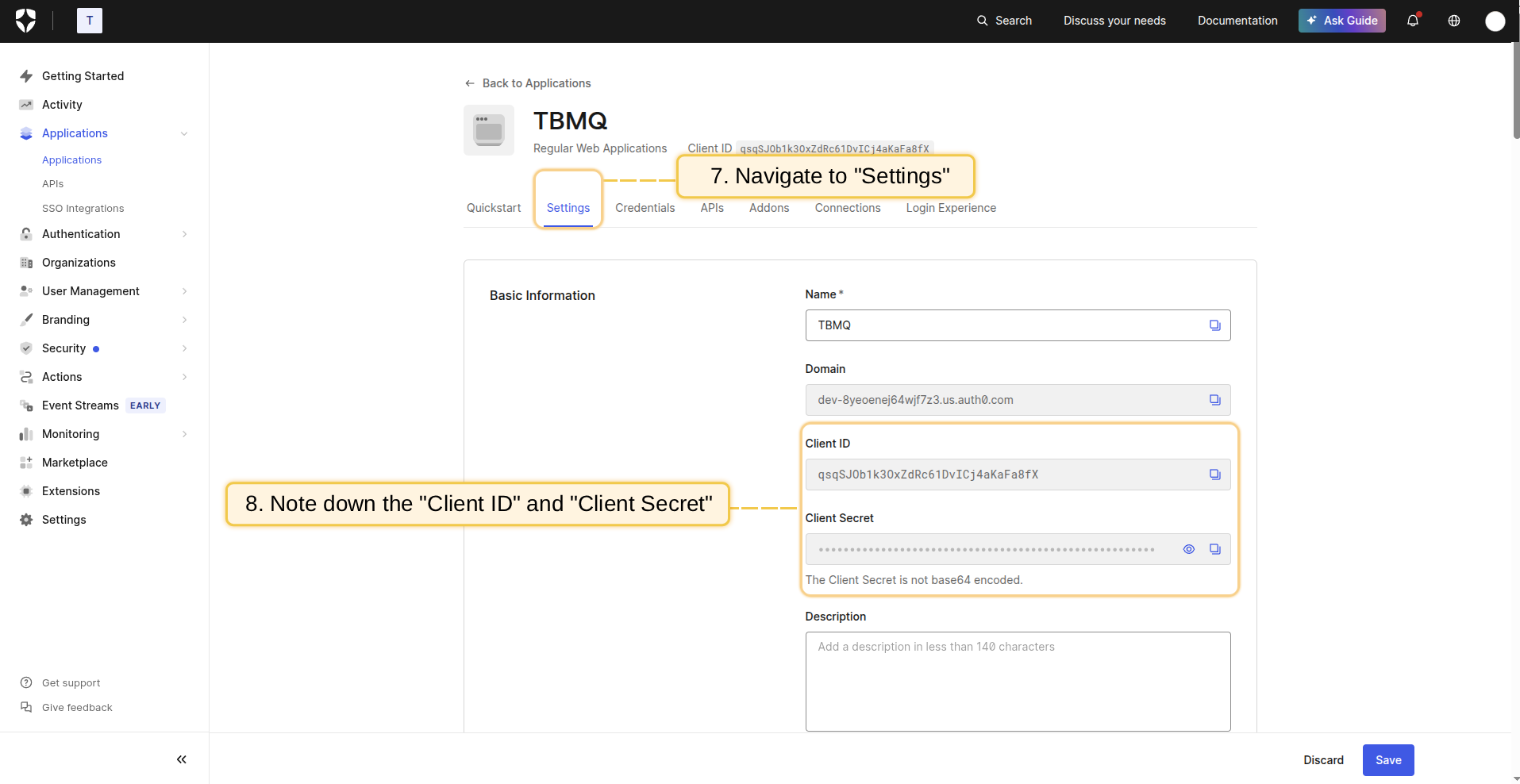 - 创建应用程序后,您将被重定向到应用程序详情页面。导航到Settings选项卡以查找Client ID和Client Secret;